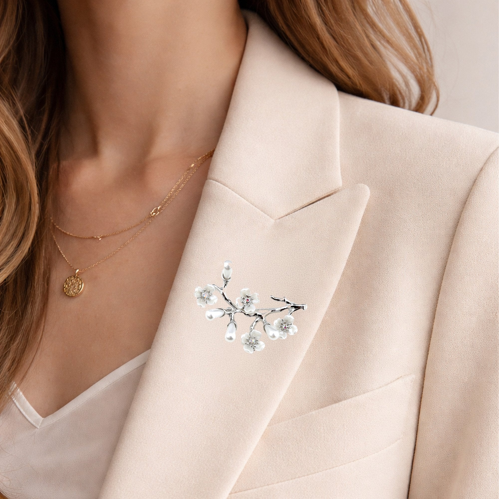 Gümüş tonlu metal gövde üzerinde dört adet sedefli beyaz çiçek ve bu çiçeklerin merkezinde yer alan inci detayları bulunmaktadır. Çiçeklerin aralarına yerleştirilen damla formundaki inci görünümlü tomurcuklar tasarıma derinlik katmaktadır. Baharın gelişini ve zarafeti simgeleyen bu broş, ceket, yaka veya fular aksesuarı olarak kullanıma uygundur.