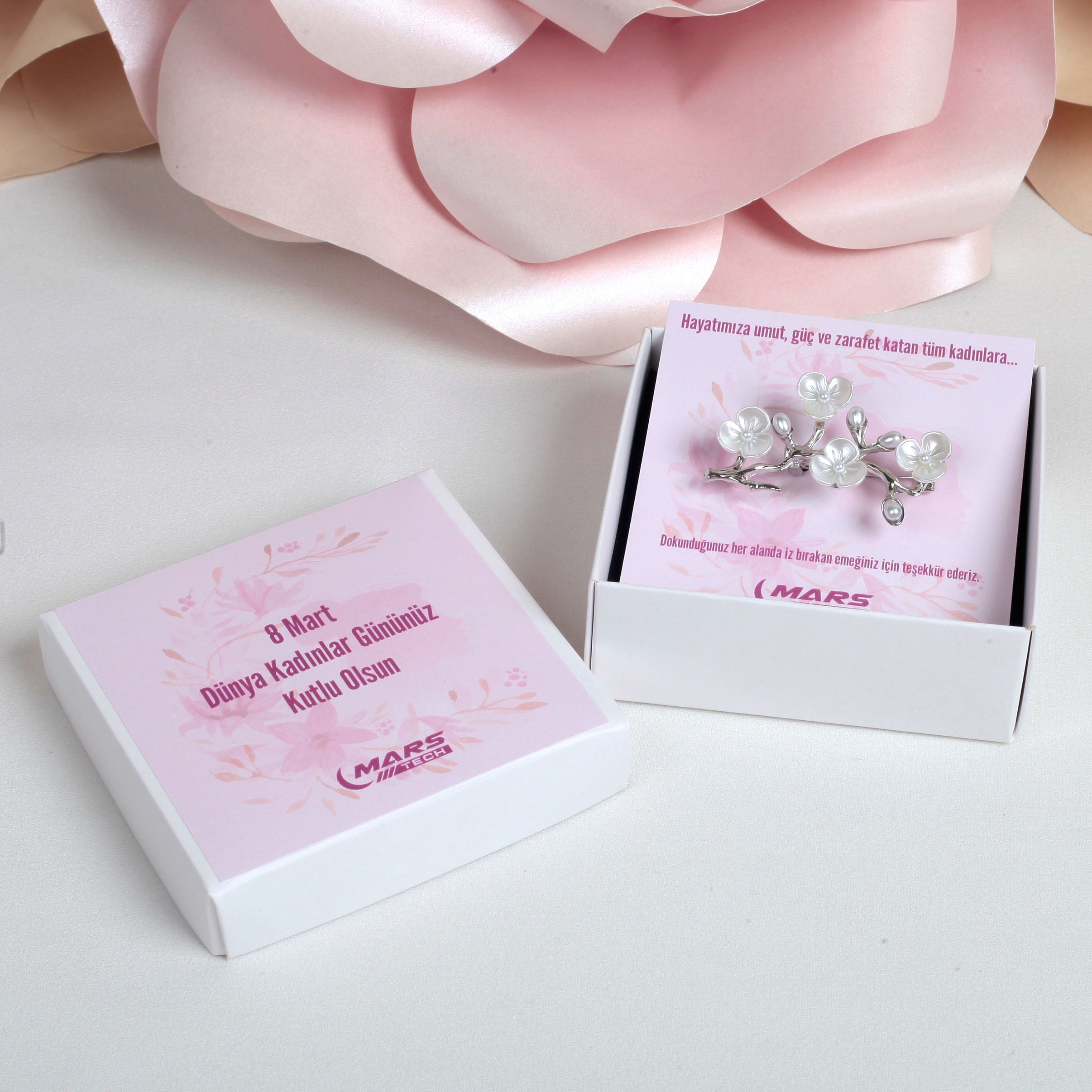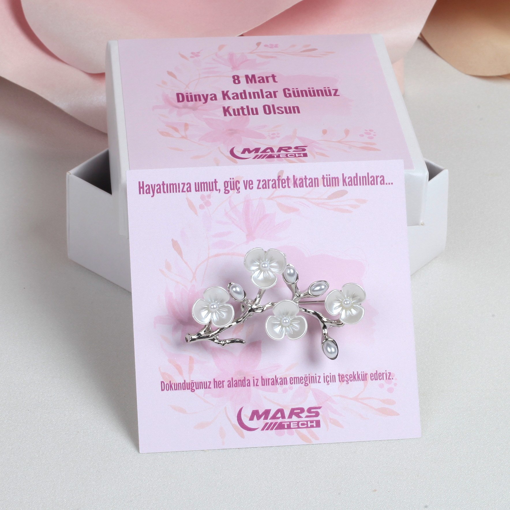 8 Mart Dünya Kadınlar Günü İnci Detaylı Bahar Dalı Broş – Kartlı ve Kutulu Kurumsal Hediye