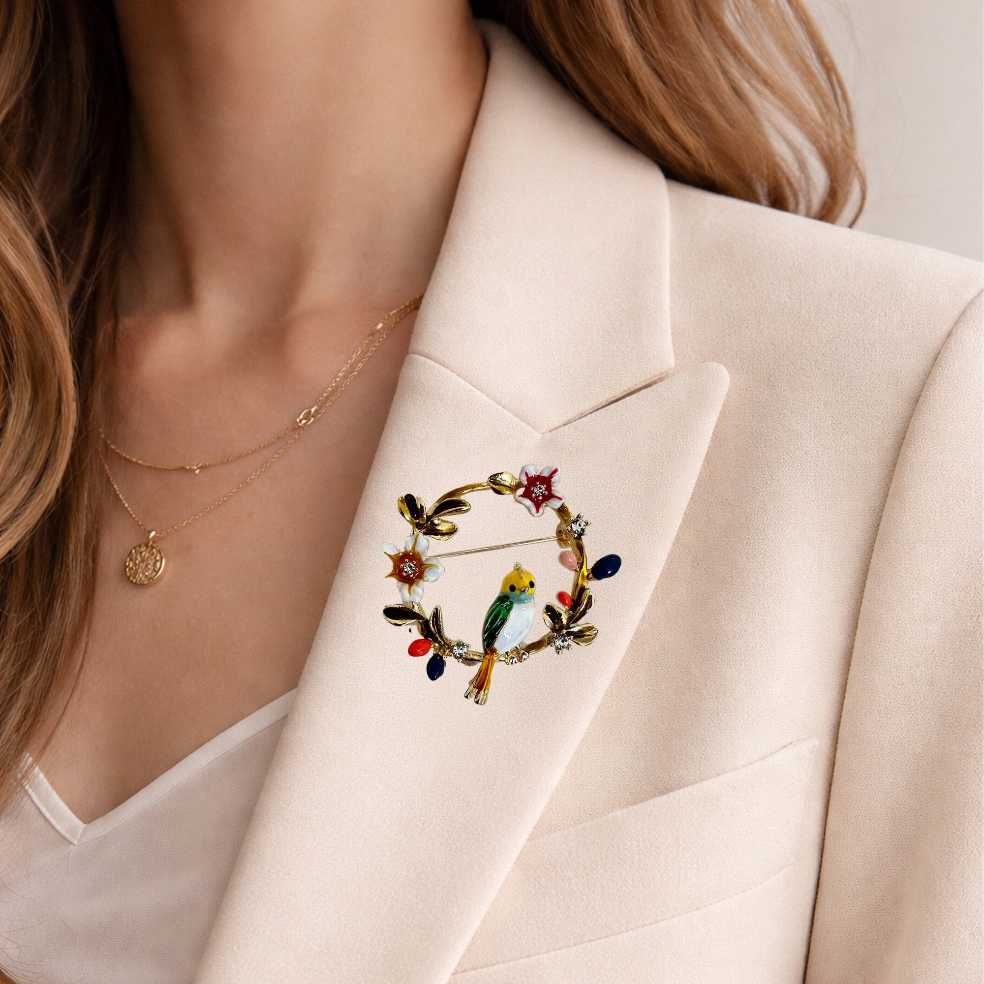 Altın tonlu metal iskelet üzerine renkli mine işçiliği ile detaylandırılmış dairesel bir formdadır. Tasarımda beyaz çiçekler, yeşil ve sarı tonlarında bir kuş figürü, renkli tomurcuklar ve aralara yerleştirilmiş küçük taş detayları yer almaktadır. Renkli ve estetik yapısı sayesinde kıyafetlerde dikkat çekici bir aksesuar olarak tercih edilebilir.