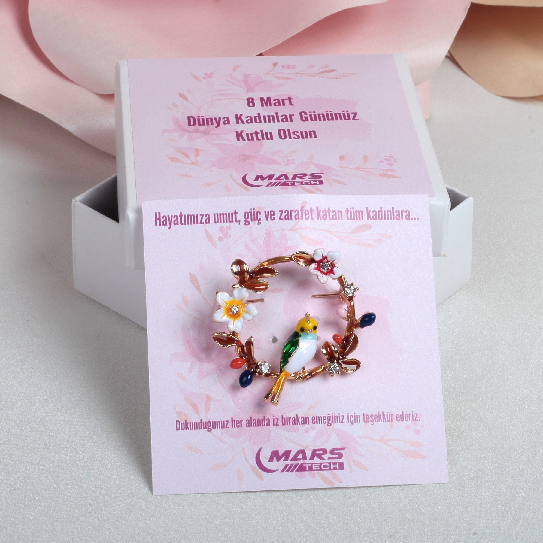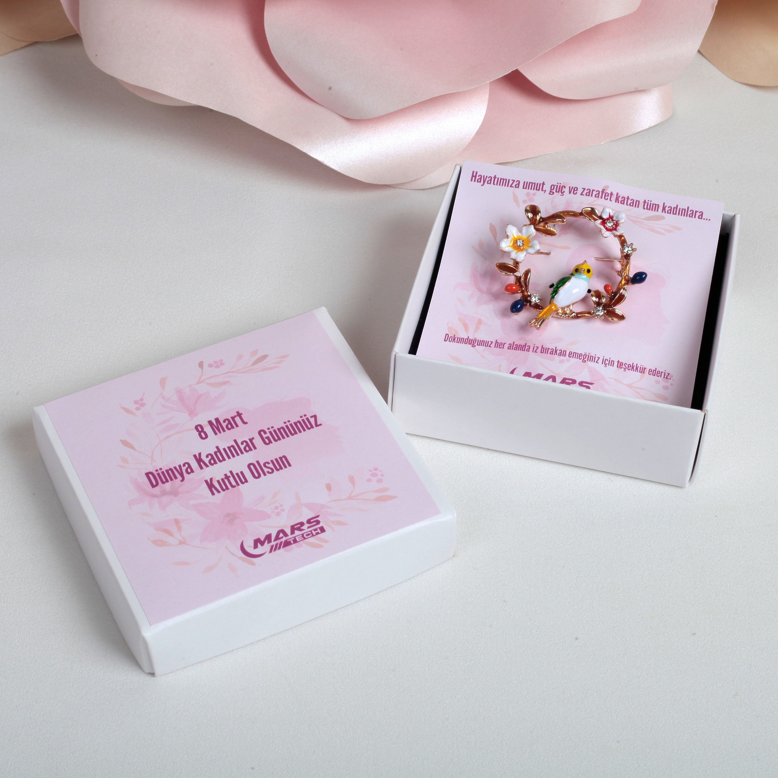 8 Mart Dünya Kadınlar Günü Kuş ve Çiçekli Dal Yaka Rozeti – Kartlı ve Kutulu Kurumsal Hediye