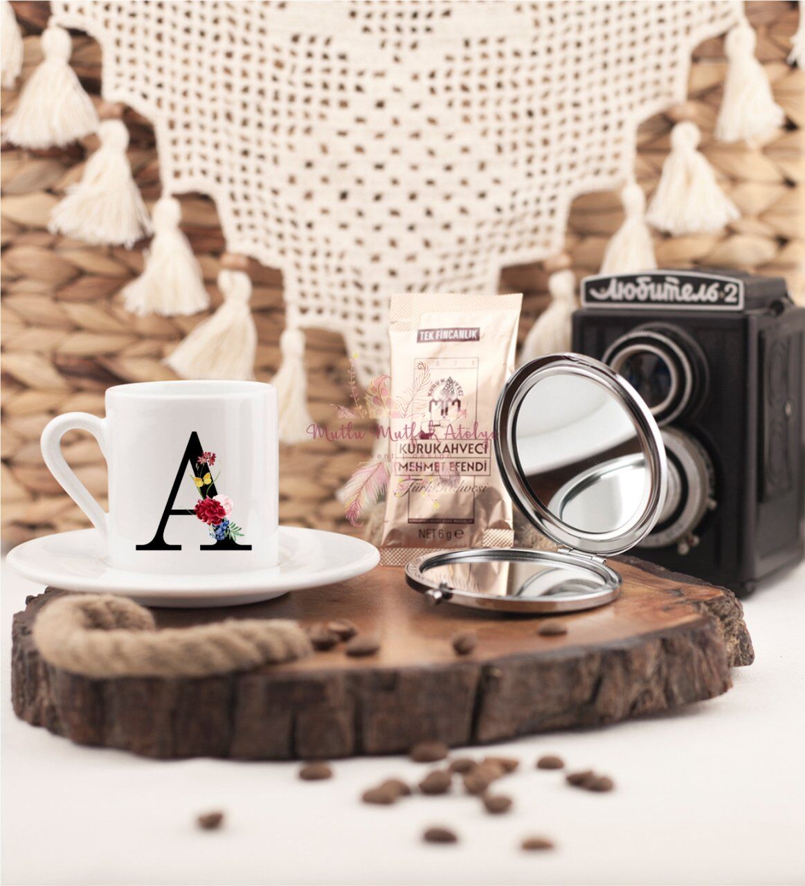 A Harfi Çiçek DesenliAynalı Kahve Fincanı