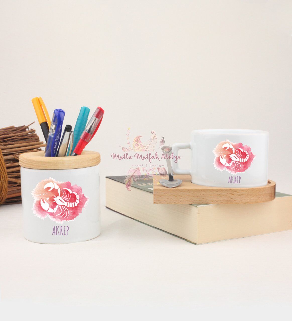 Ahşap Altlıklı Fincan ve Kalemlik Seti Akrep Burcu