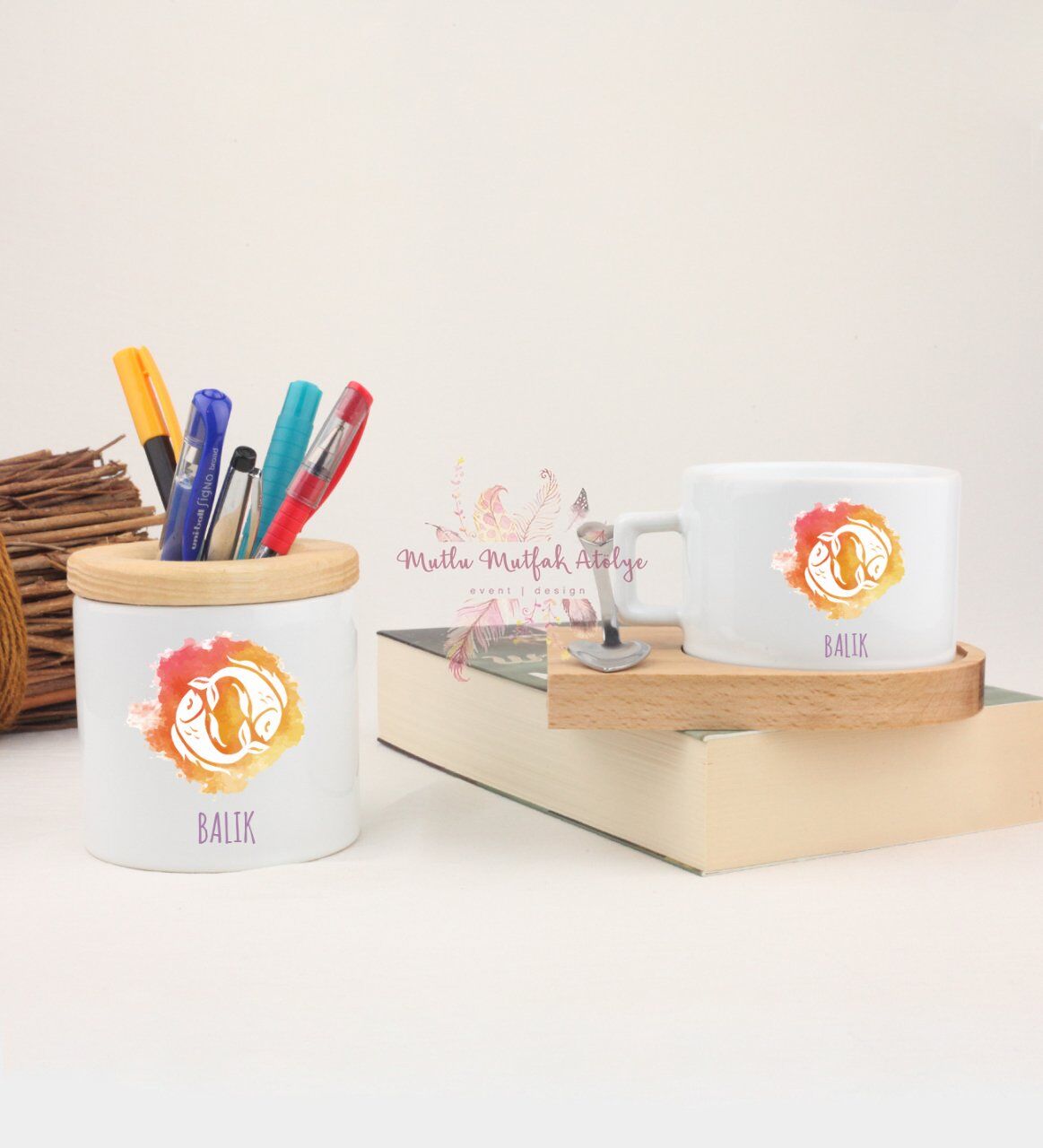Ahşap Altlıklı Fincan ve Kalemlik Seti Balık Burcu