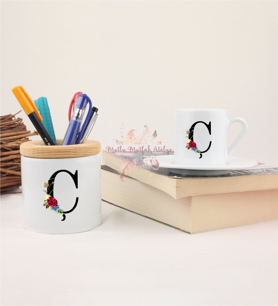 Ç Harfi Çiçek Desenli Kalemlik ve Türk Kahvesi Fincanı