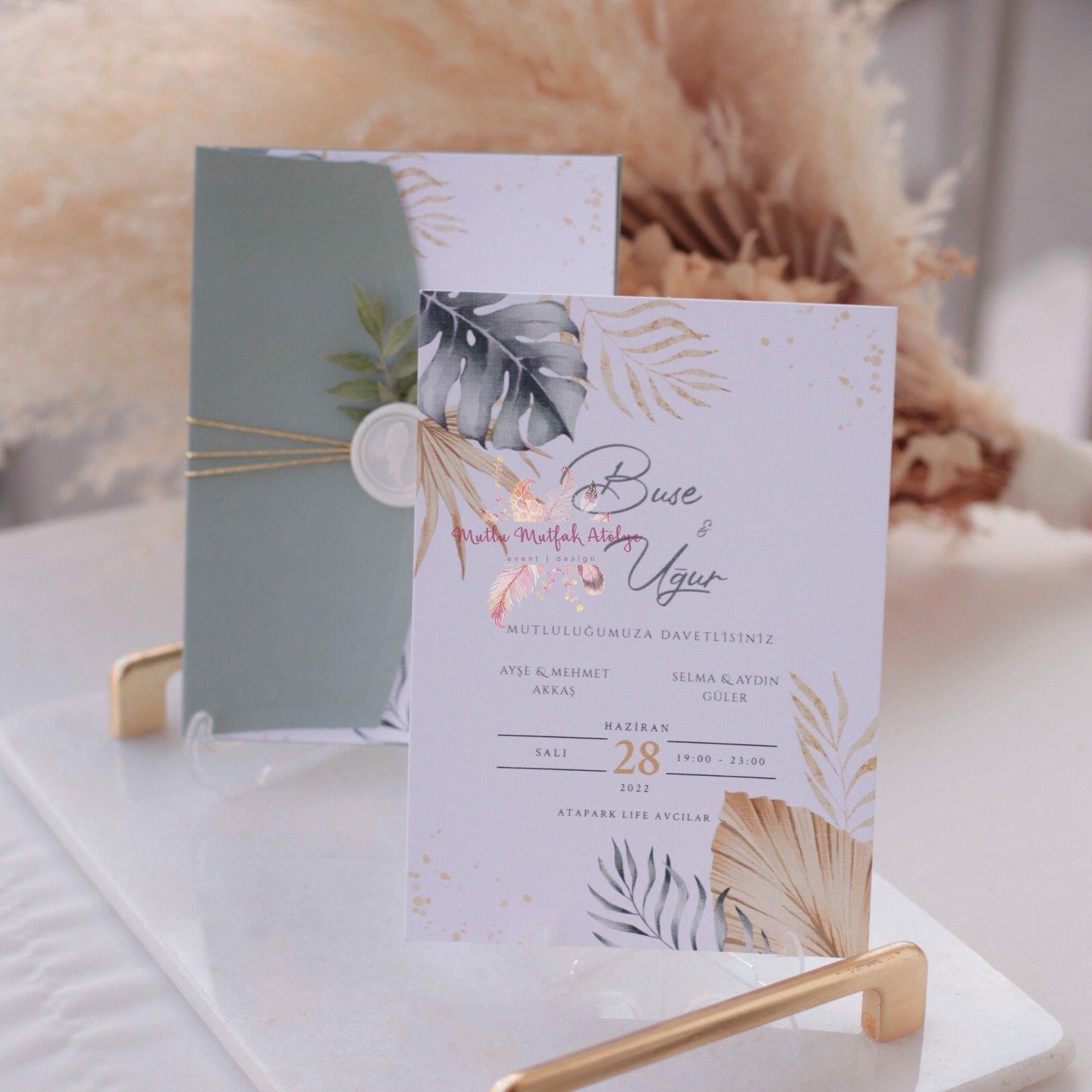 Standart davetiyelerde çiçekli mühür deseni kullanılmaktadır. Kişiye özel mühür için ek olarak mühür aparatını satın almanız gerekmektedir.