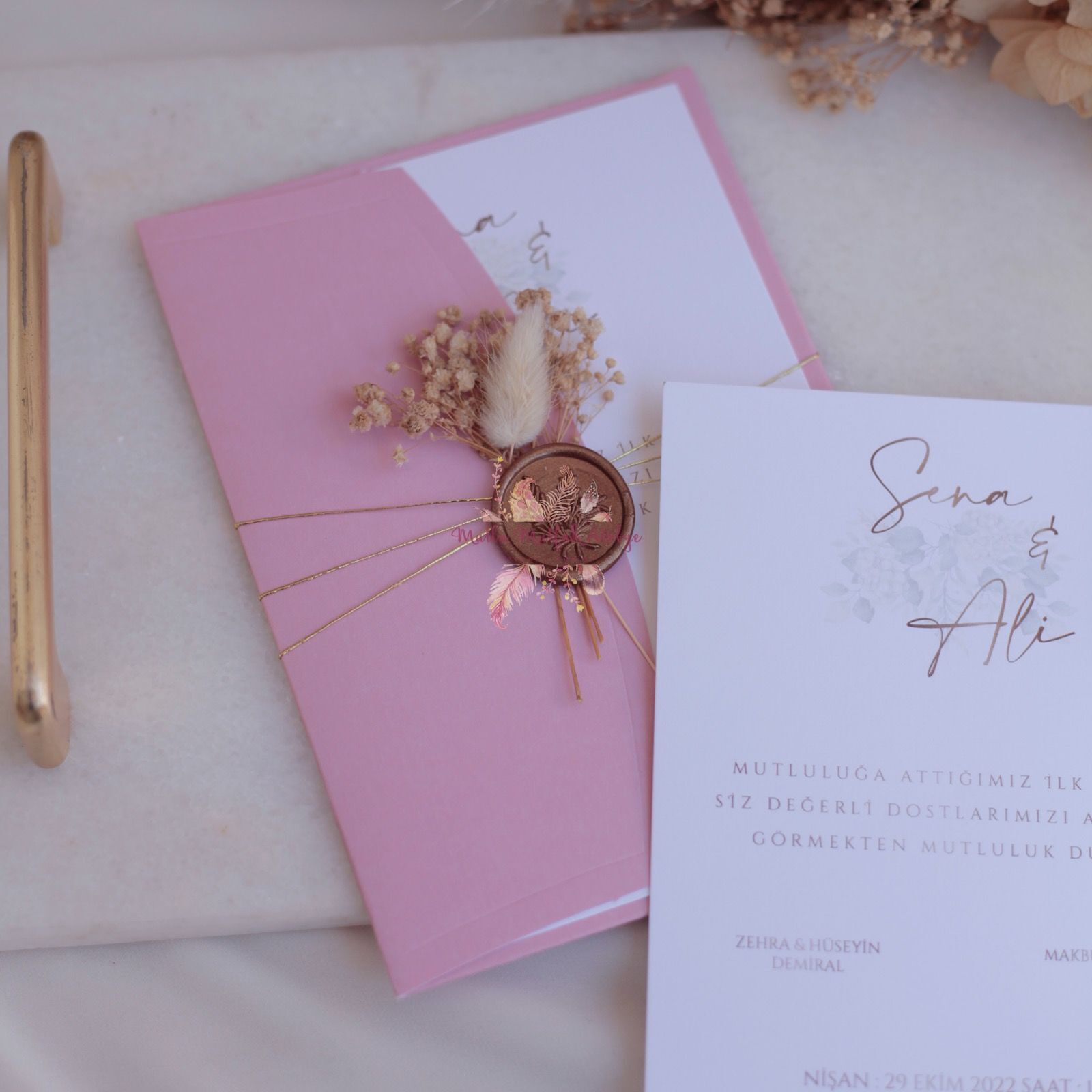 Standart davetiyelerde çiçekli mühür deseni kullanılmaktadır. Kişiye özel mühür için ek olarak mühür aparatını satın almanız gerekmektedir.