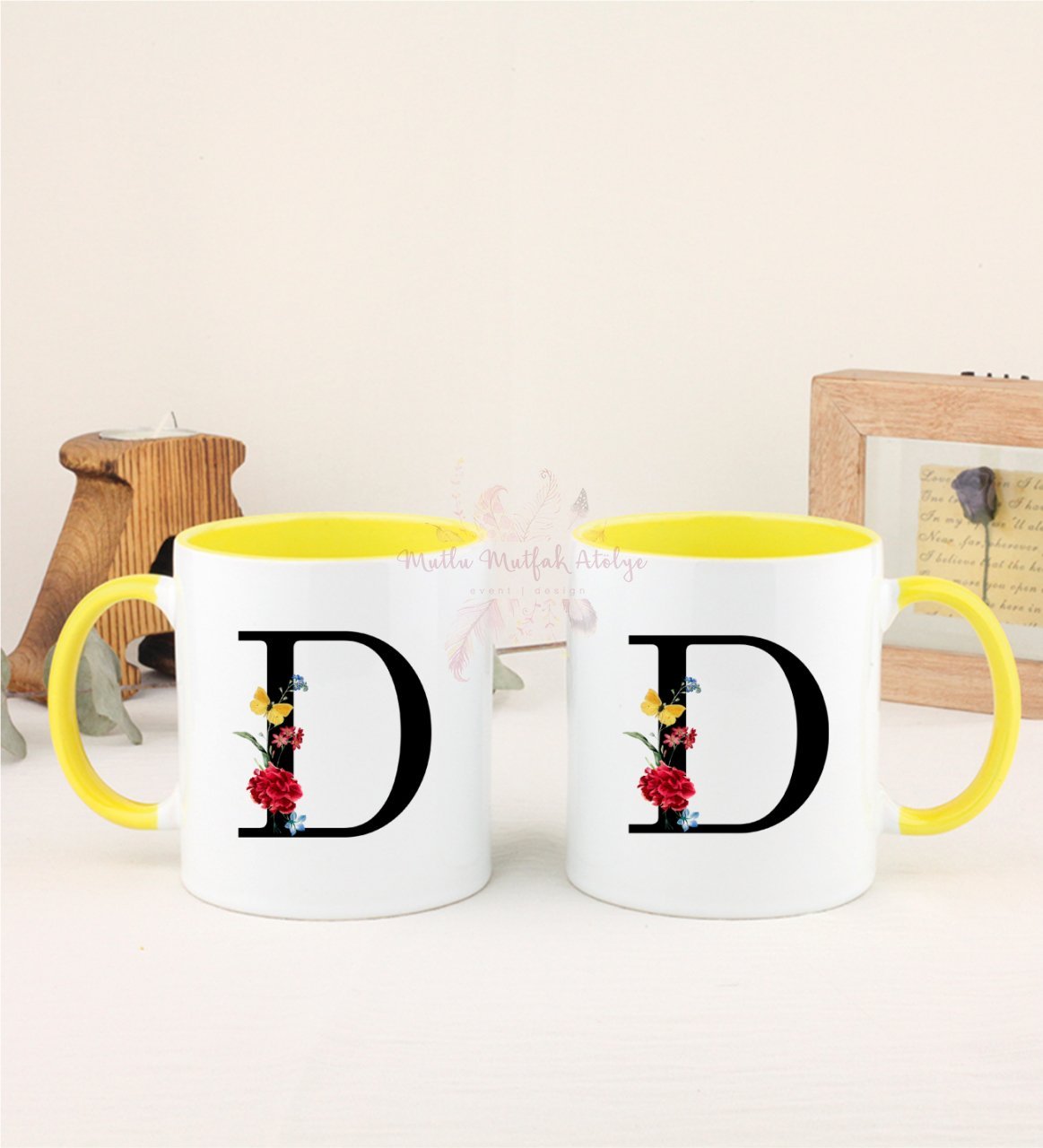 D Harfi Çiçek Desenli İkili Sarı Kupa Bardak