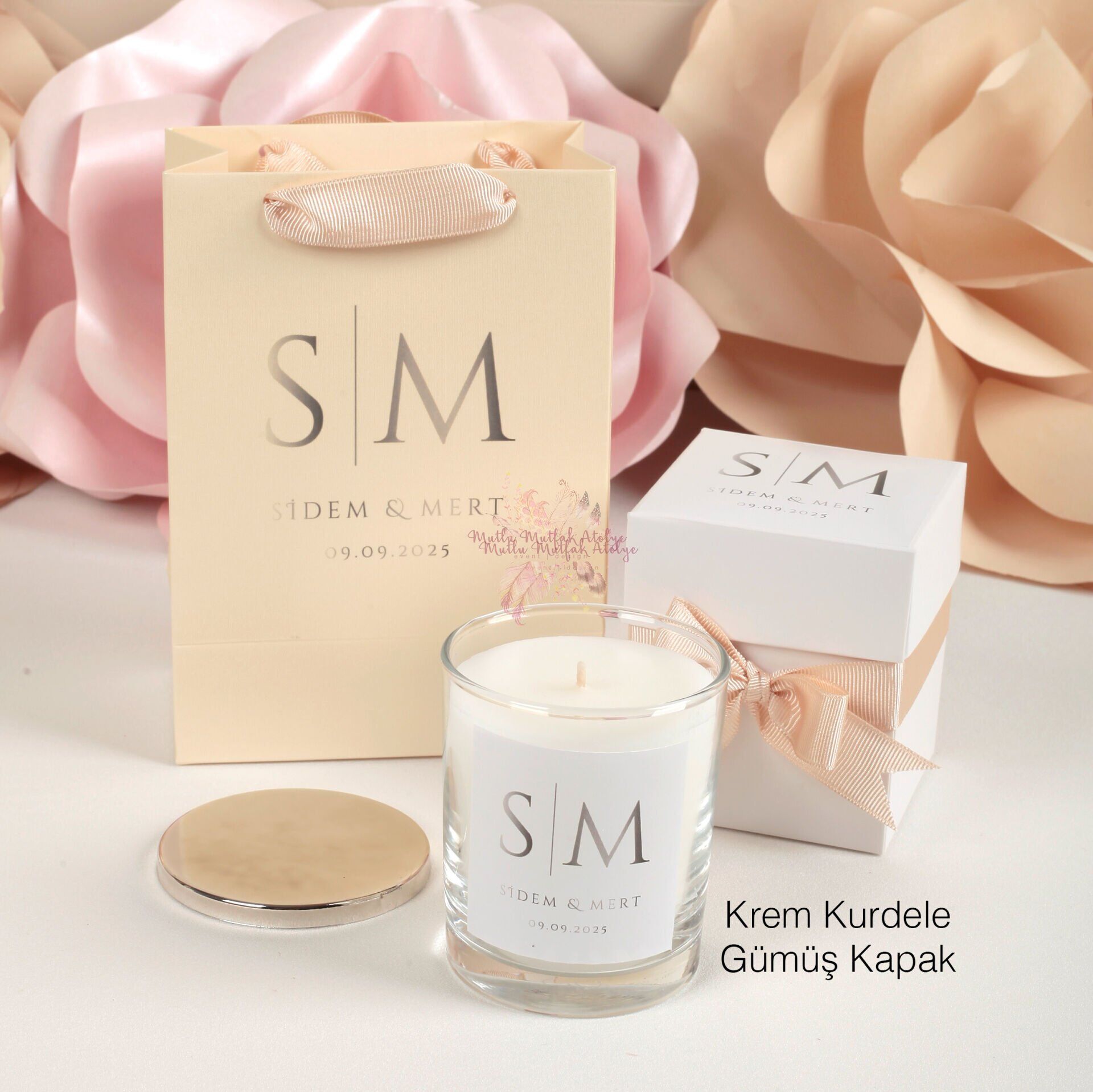 Düğün - Nişan Hediyeliği Vanilya Kokulu Kapaklı Büyük Boy Mum ve Baskılı Çanta Hediye Seti
