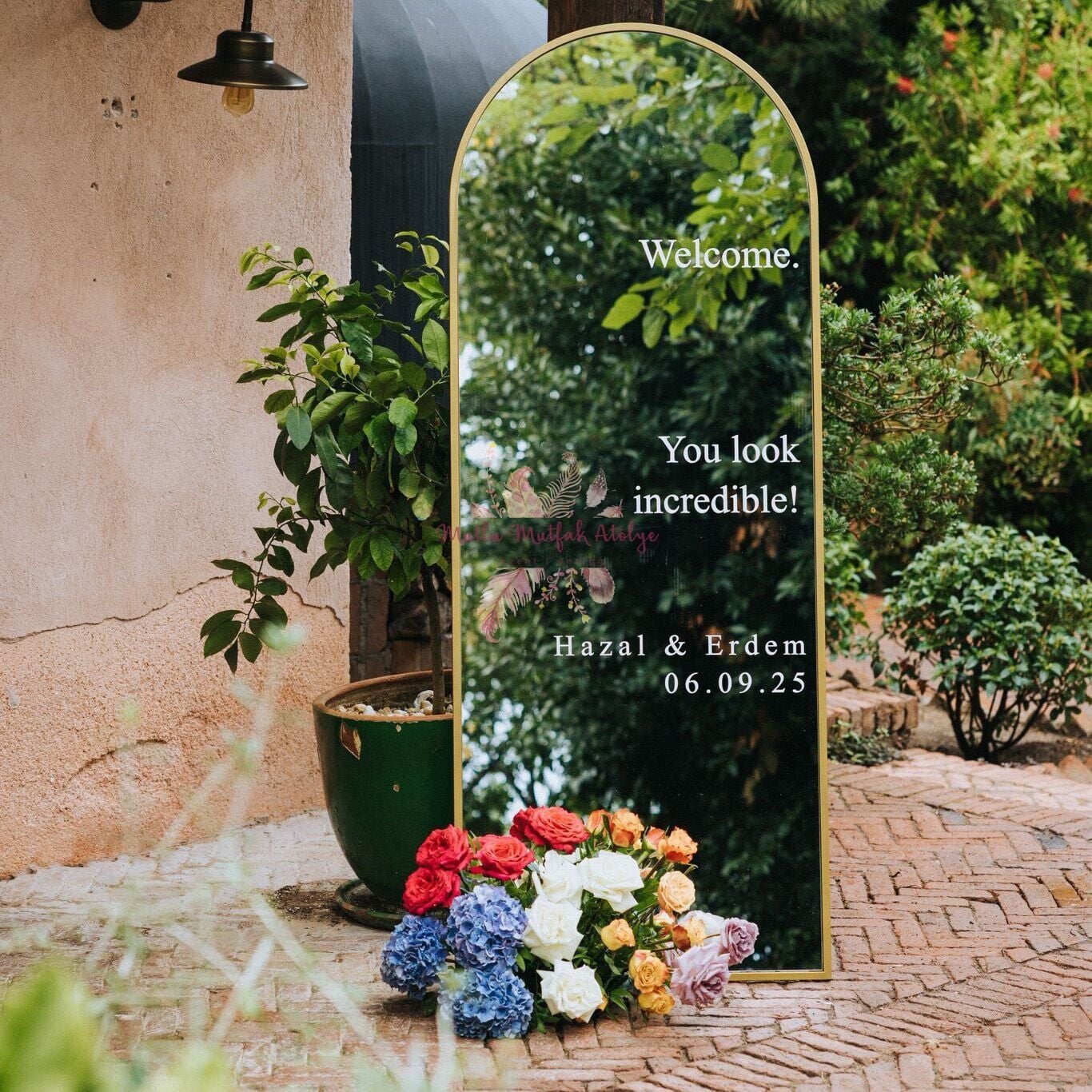 Kendi boy aynanızı profesyonel bir karşılama panosuna dönüştürmeniz için hazırladığımız kişiye özel ayna yazısı, yüksek kaliteli folyo kesim teknolojisiyle üretilmektedir. 70x180 cm ve benzeri tüm aynalarla uyumlu olan bu folyo sticker, davetlerinizin girişinde misafirlerinizi etkileyici bir görselle karşılamanızı sağlar.