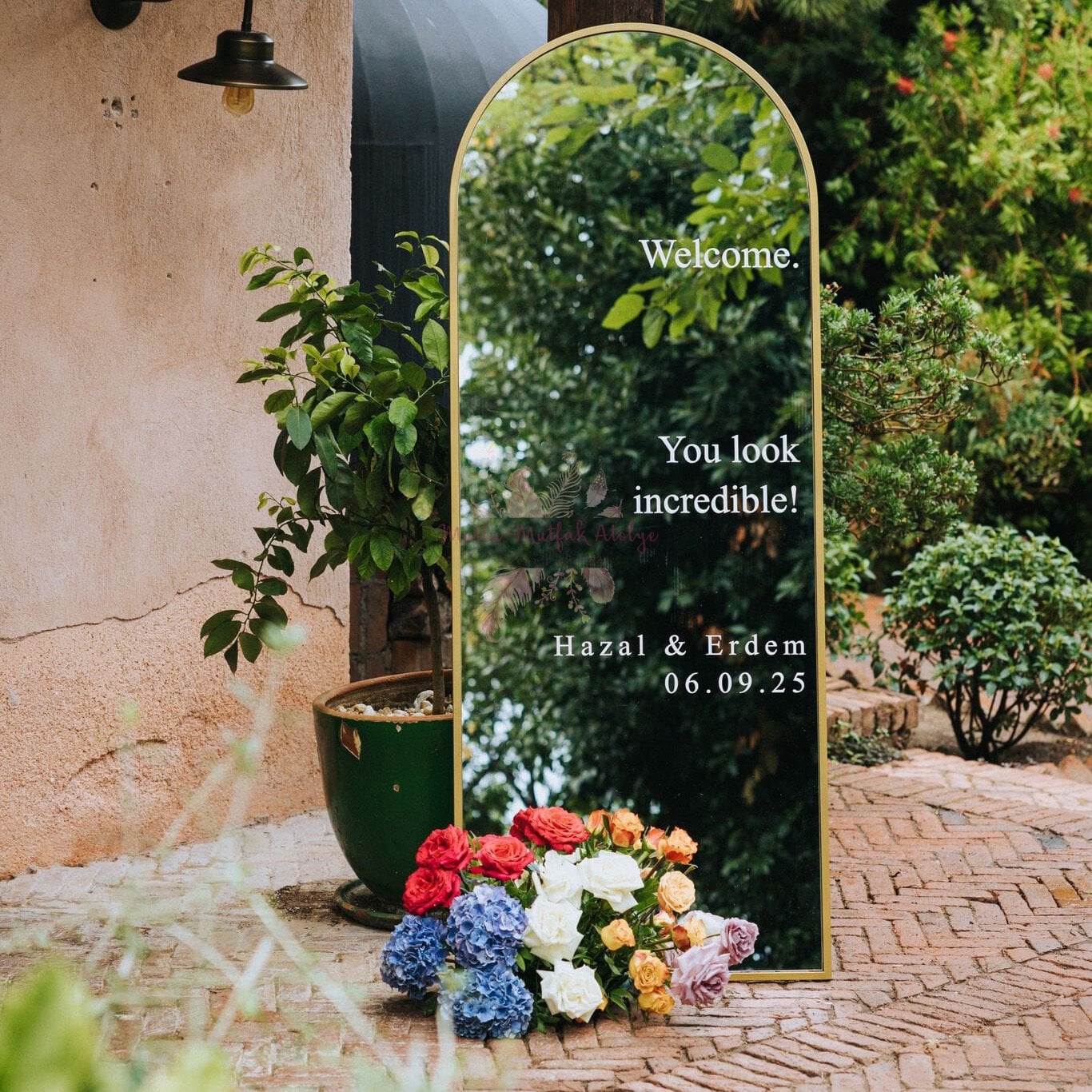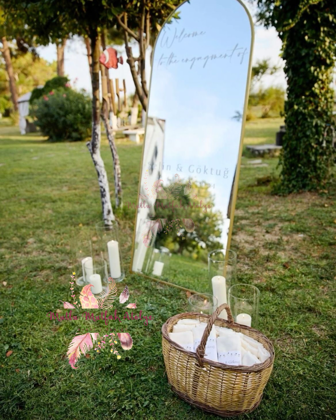 Kendi boy aynanızı profesyonel bir karşılama panosuna dönüştürmeniz için hazırladığımız kişiye özel ayna yazısı, yüksek kaliteli folyo kesim teknolojisiyle üretilmektedir. 70x180 cm ve benzeri tüm aynalarla uyumlu olan bu folyo sticker, davetlerinizin girişinde misafirlerinizi etkileyici bir görselle karşılamanızı sağlar.