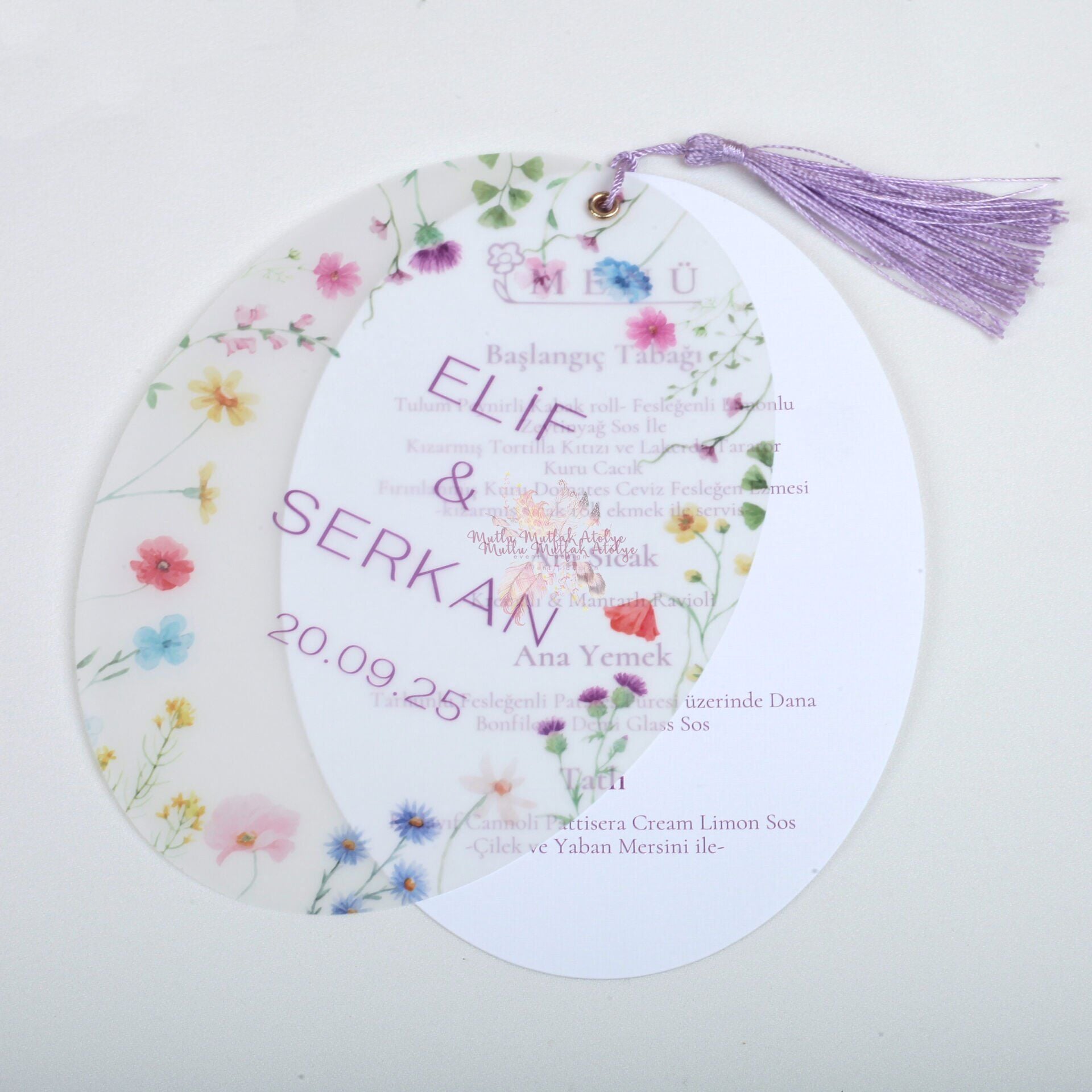 Düğün, nişan, kına ve birçok etkinlik için oval püsküllü menü kartı
