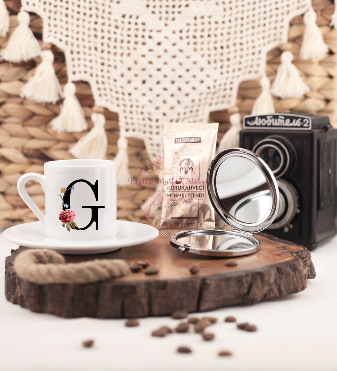 F Harfi Çiçek Desenli Aynalı Kahve Fincanı