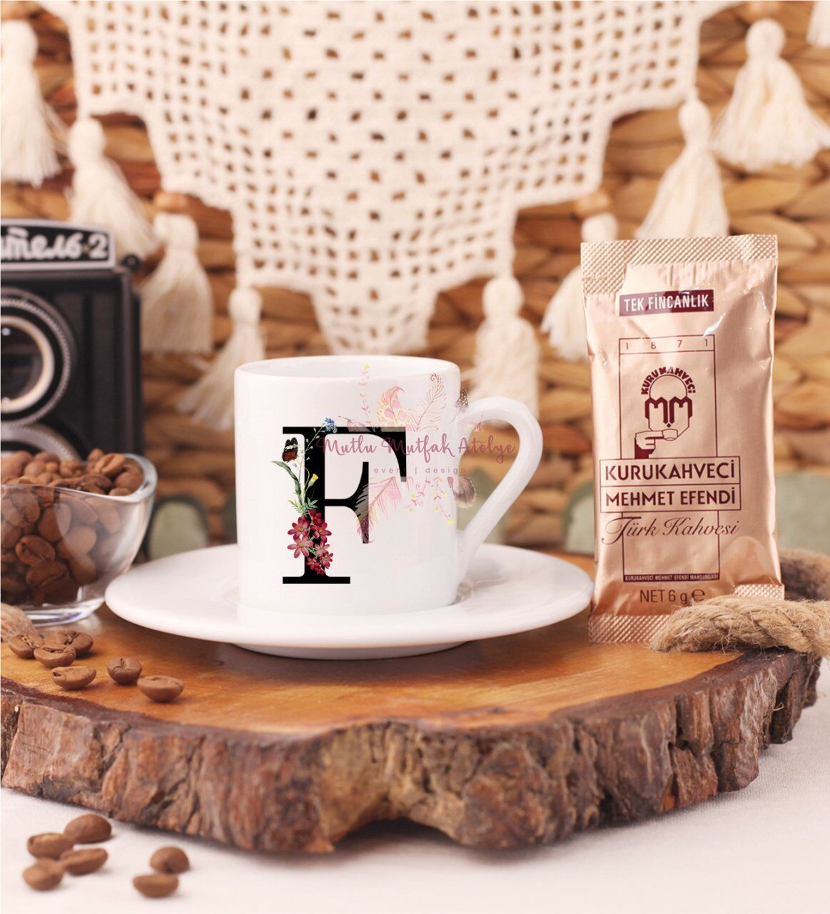F Harfi Çiçek Desenli Türk Kahvesi Fincanı