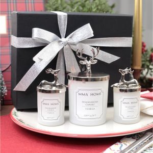 Ürün içeriğinde hediye kutusu, 2 adet 60gr küçük boy mum, 1 adet 135gr büyük boy mum, cam bardak, Vanilya kokulu mum, geyik kapak seti yer almaktadır.