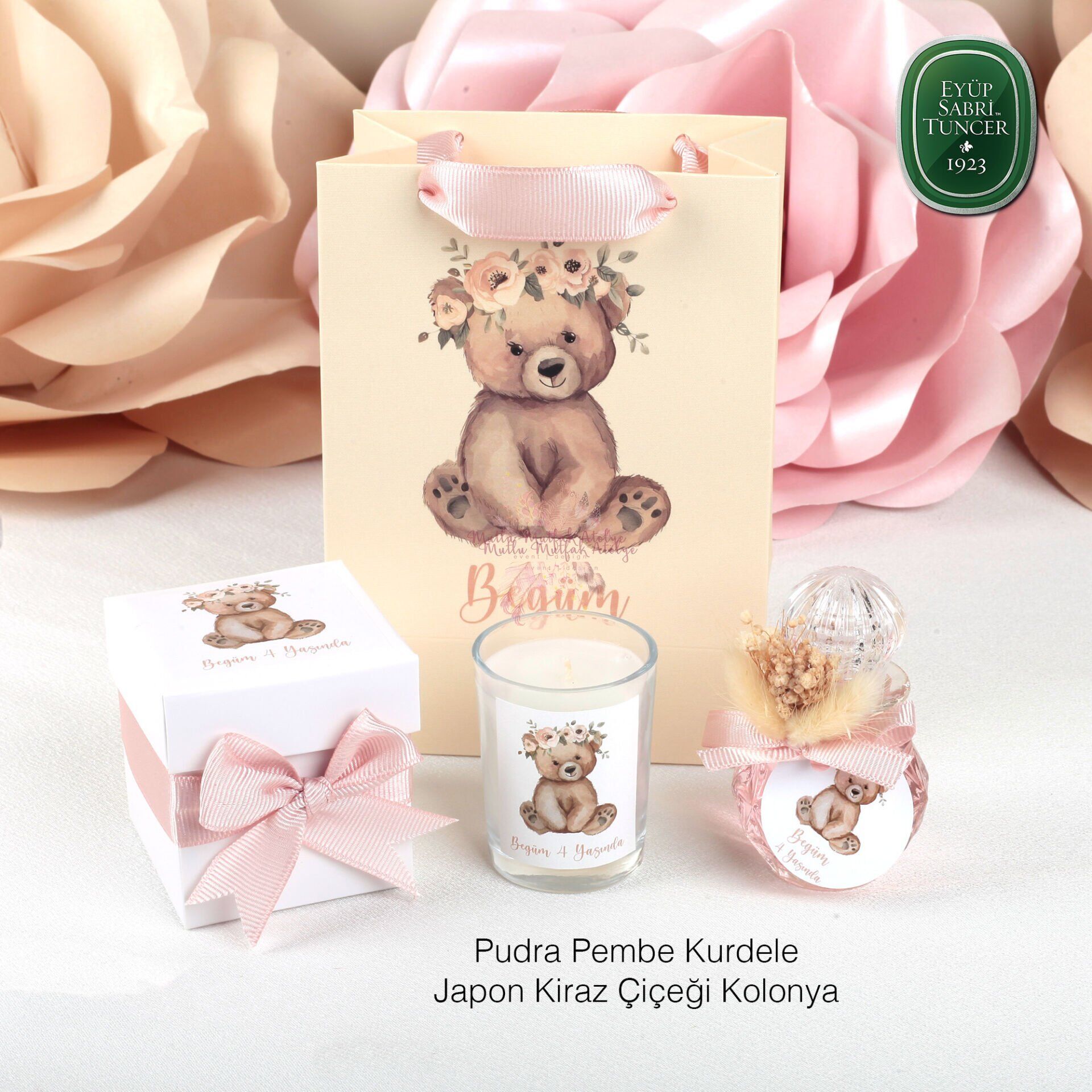 Ayıcık Figürlü Hediyelik Kutulu Kokulu Mum, Kolonya ve Baskılı Karton Çanta Seti