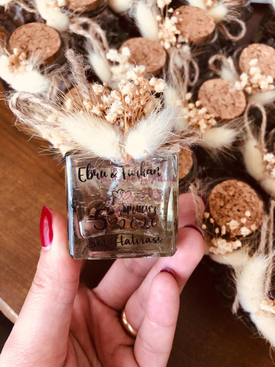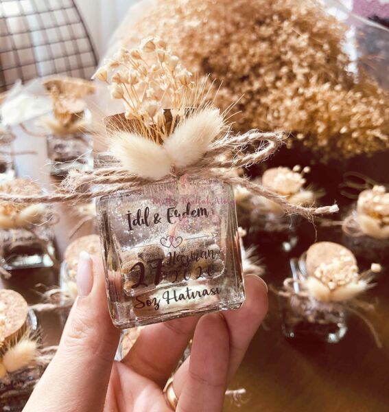 Dış süslemesinde, etiket, cipso, pamuk otu ve jüt ip kullanılmıştır.