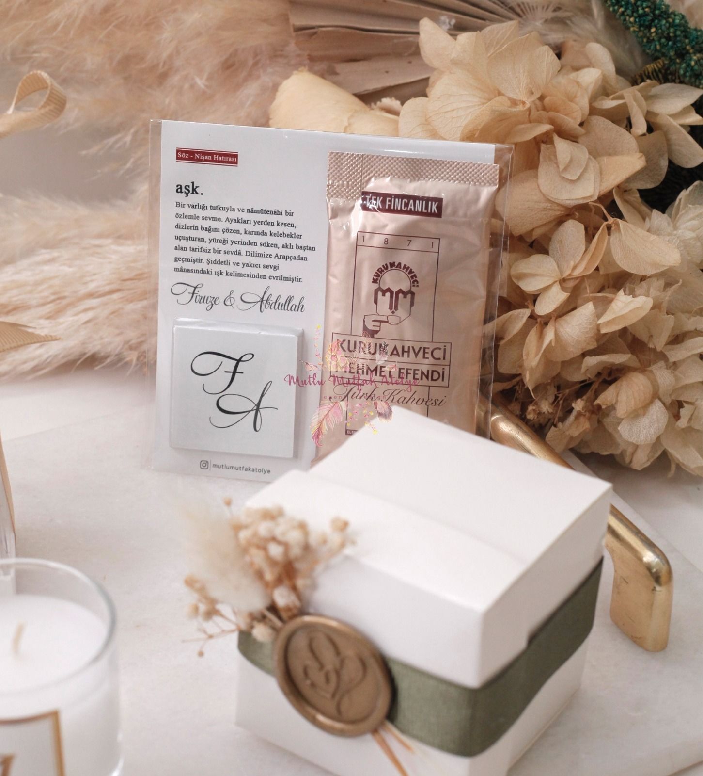 Hediyelik Mühürlü Çiçekli Mum Ve Çikolatalı Kahveli Kart Seti