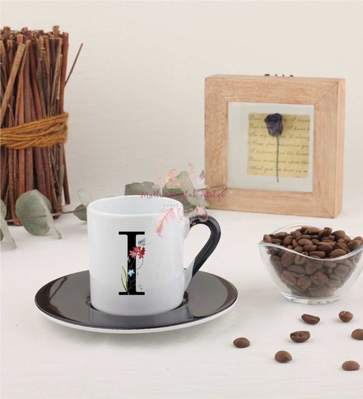 I Harfi Çiçek Desenli Siyah Türk Kahvesi Fincanı