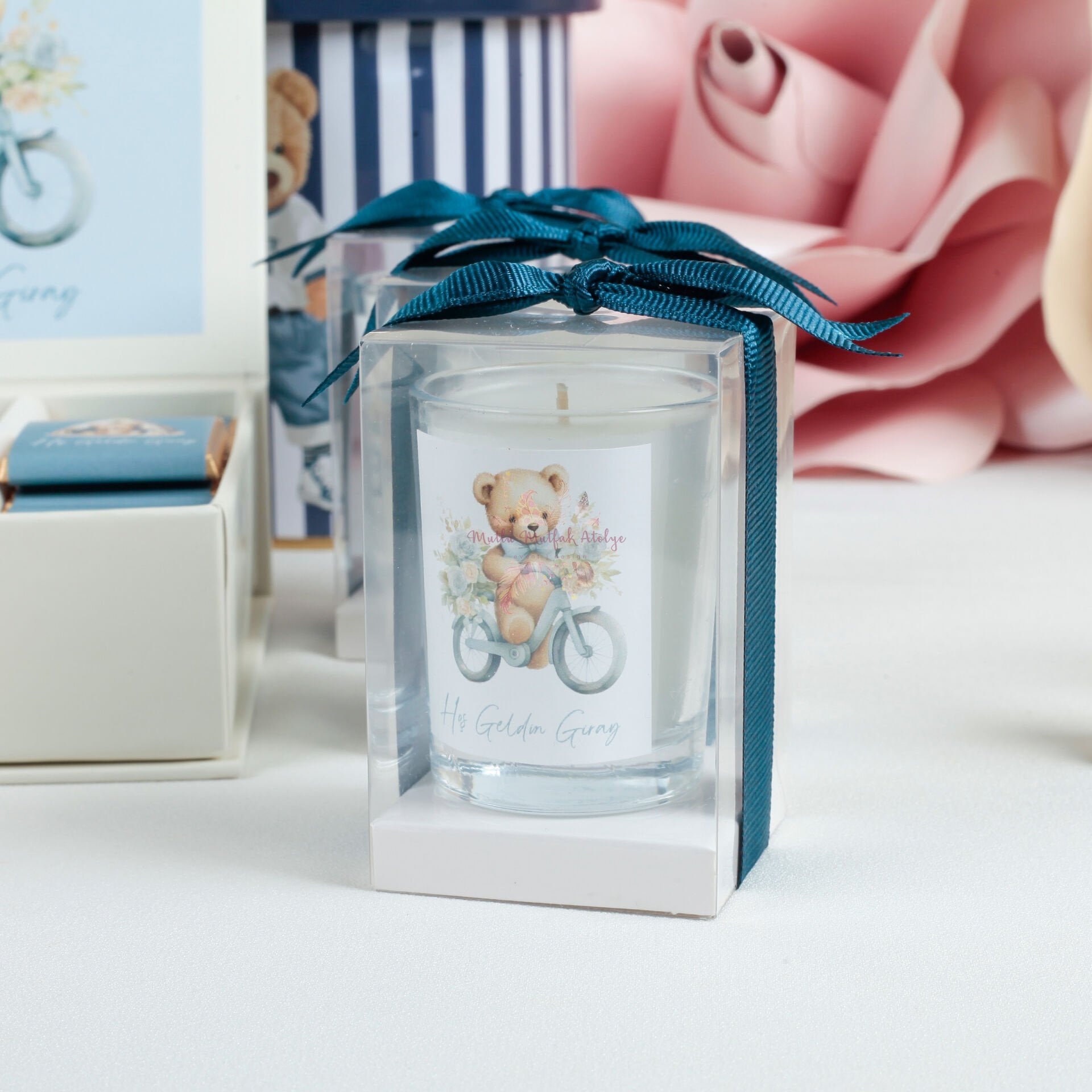 Hediyelik ayıcık konseptli yükseltili kokulu mum, özel günlerde harika bir hediye seçeneği! Yeni doğan bebek kutlamaları, doğum günü partileri ve baby shower organizasyonları için ideal.