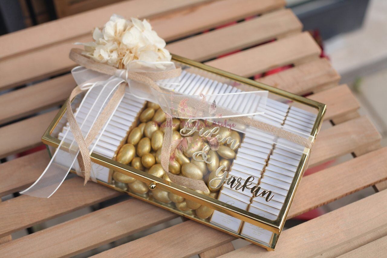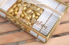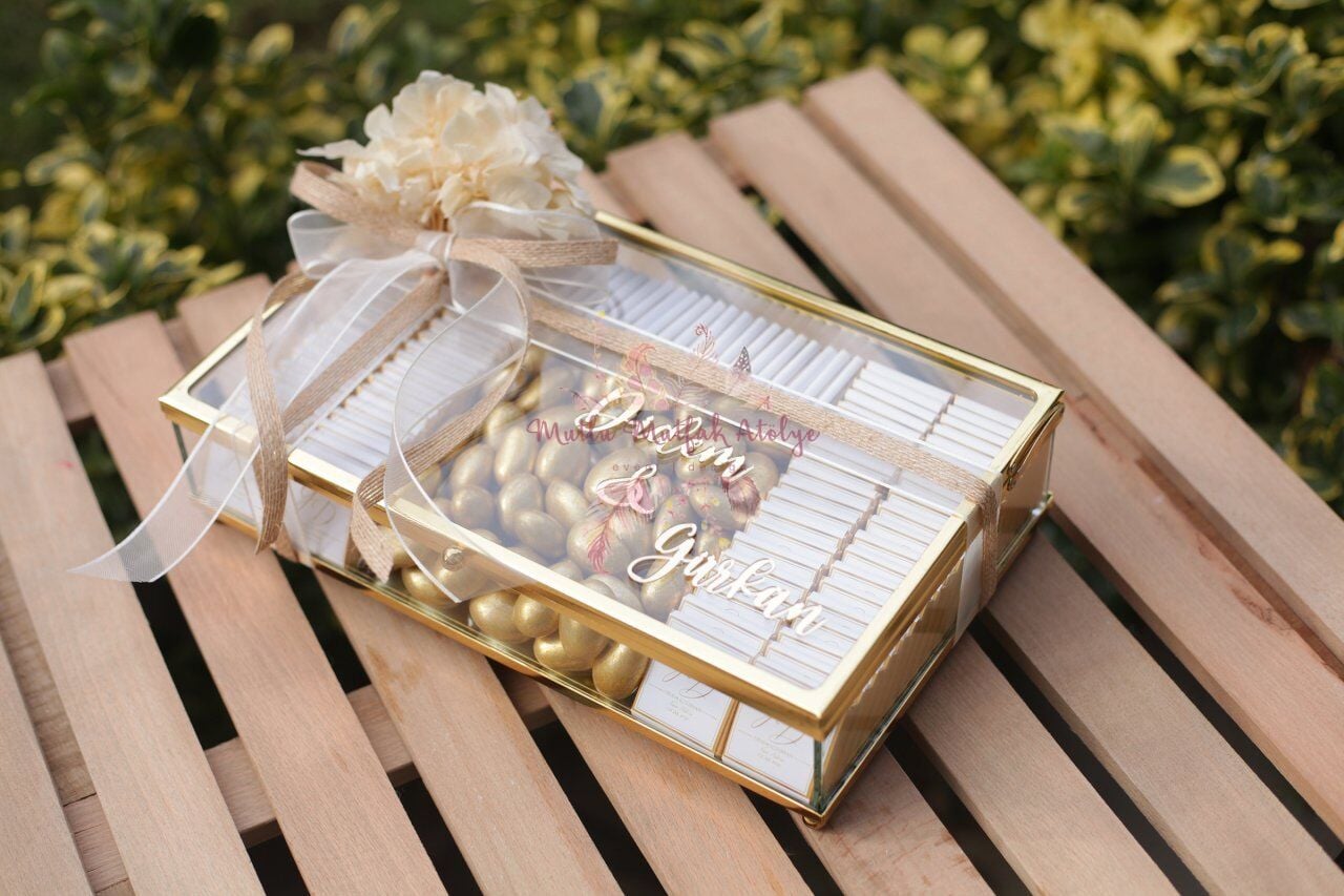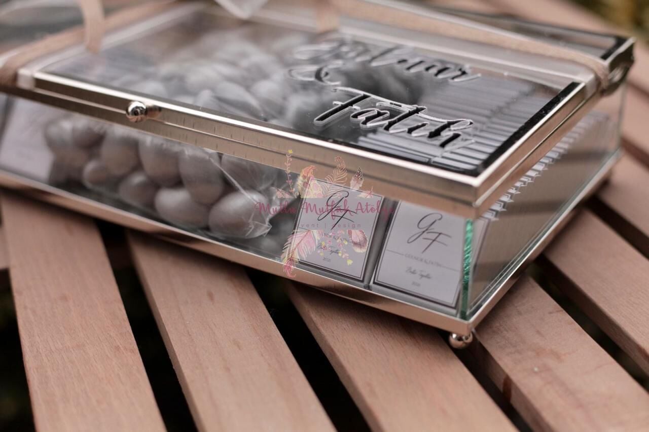 - Cam kutu içerisinde 100 adet sargılı madlen çikolata ve 500gr gold kaplı draje çikolata bulunmaktadır.