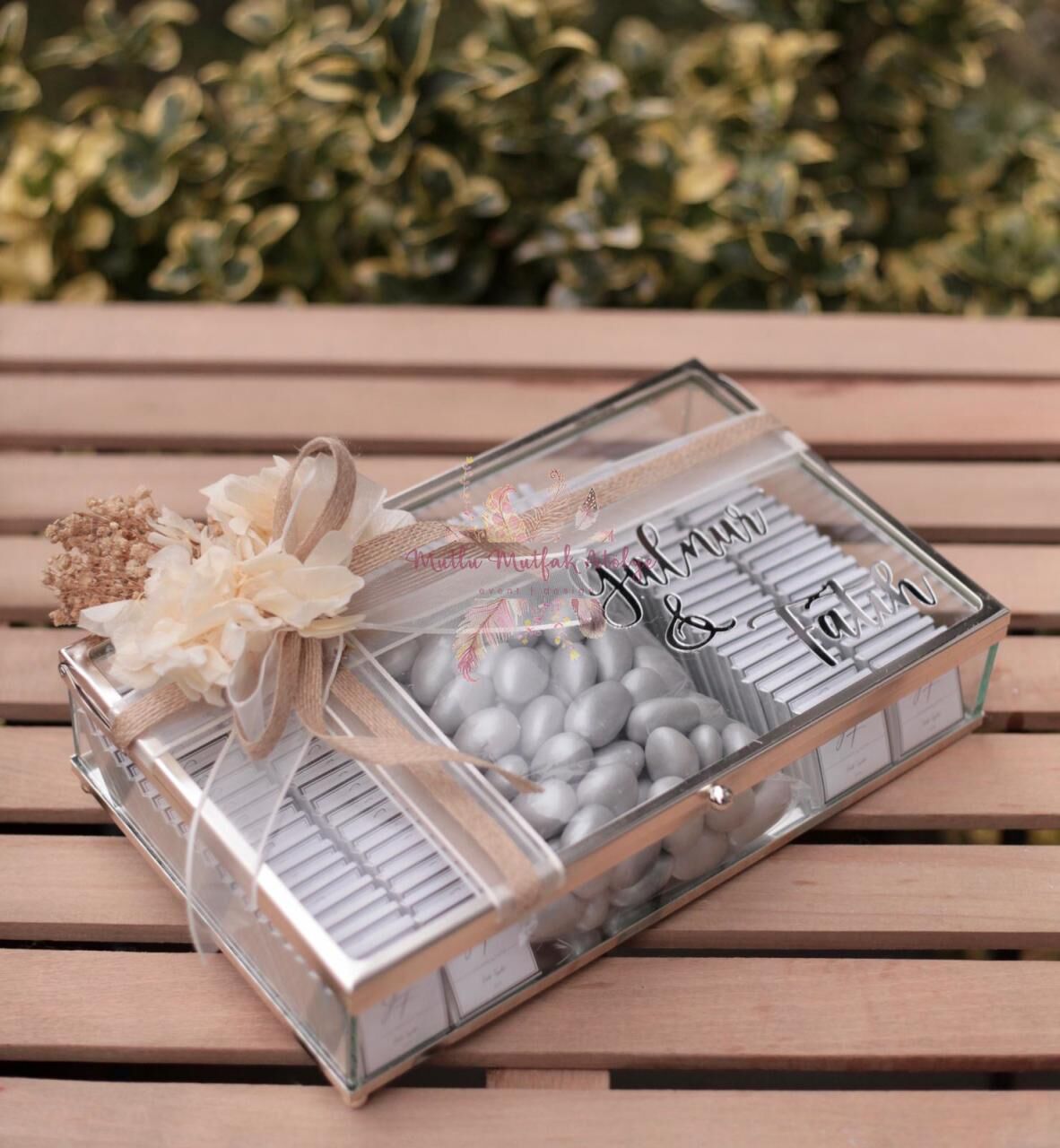 İsimli Cam Kutulu Çiçek Süslemeli Söz Nişan Çikolatası