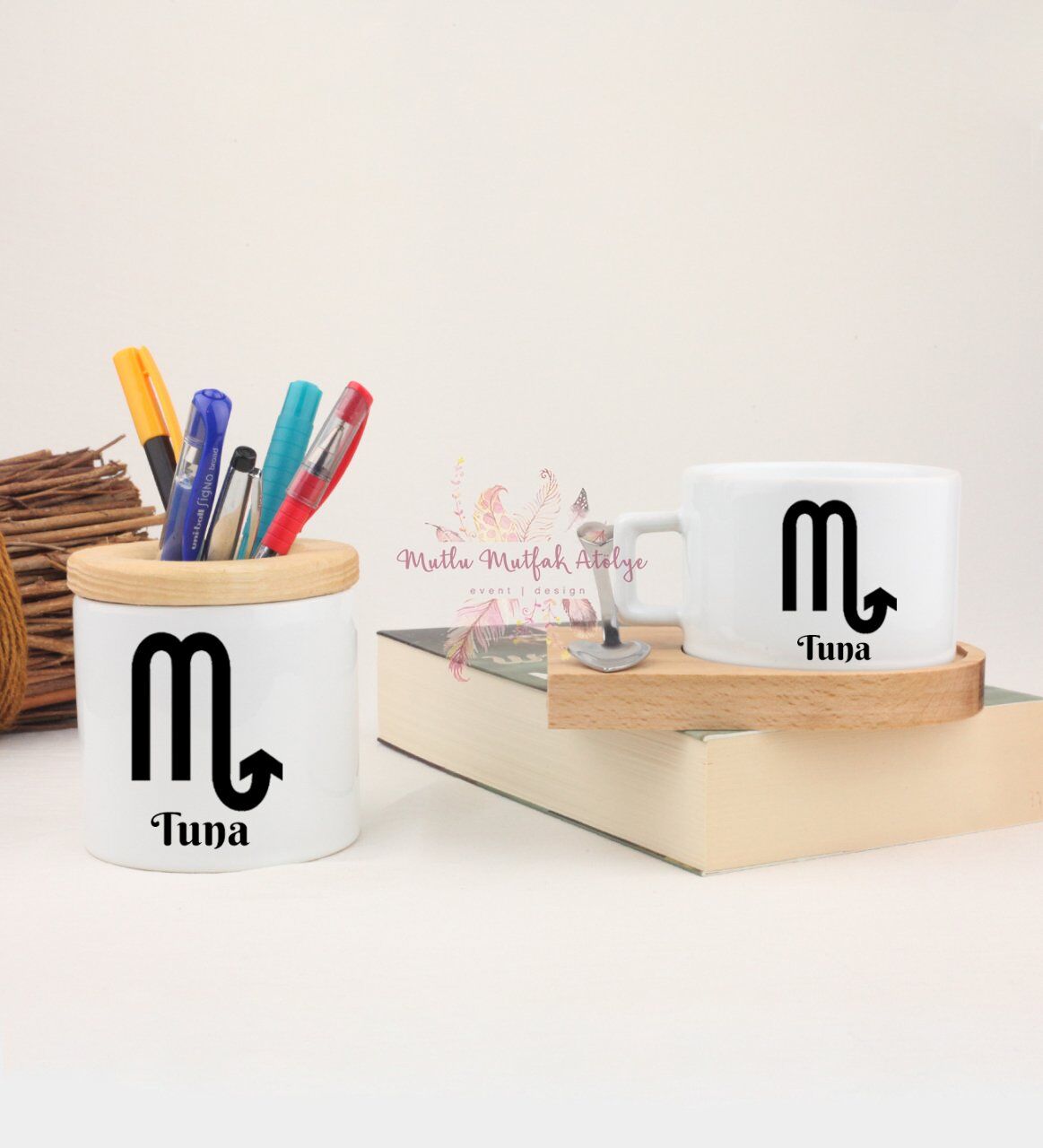 Kişiye Özel Ahşap Altlıklı Fincan ve Kalemlik Seti Akrep Burcu