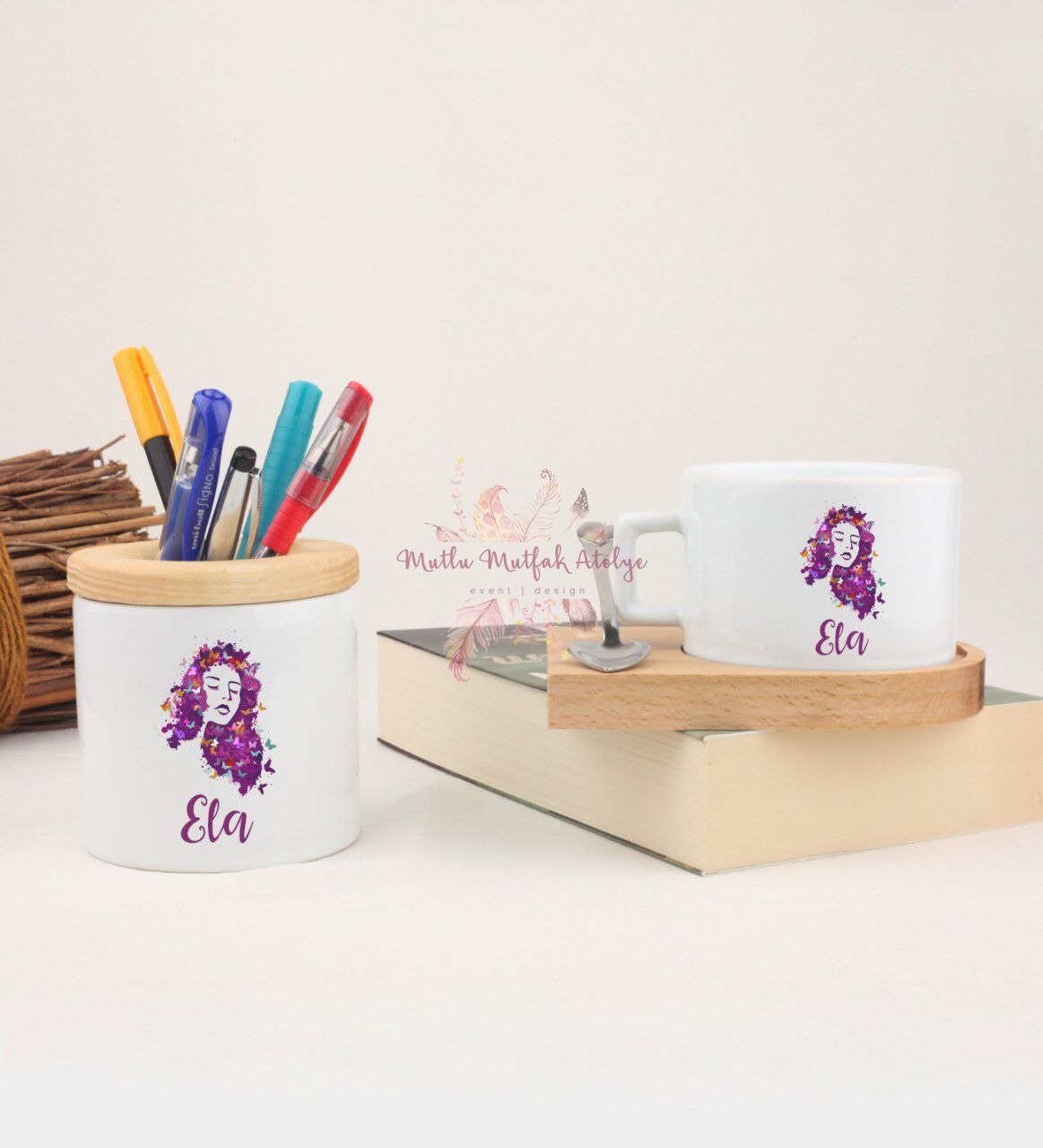 Kişiye Özel Ahşap Altlıklı Fincan ve Kalemlik Seti İsimli Kadın Figürlü