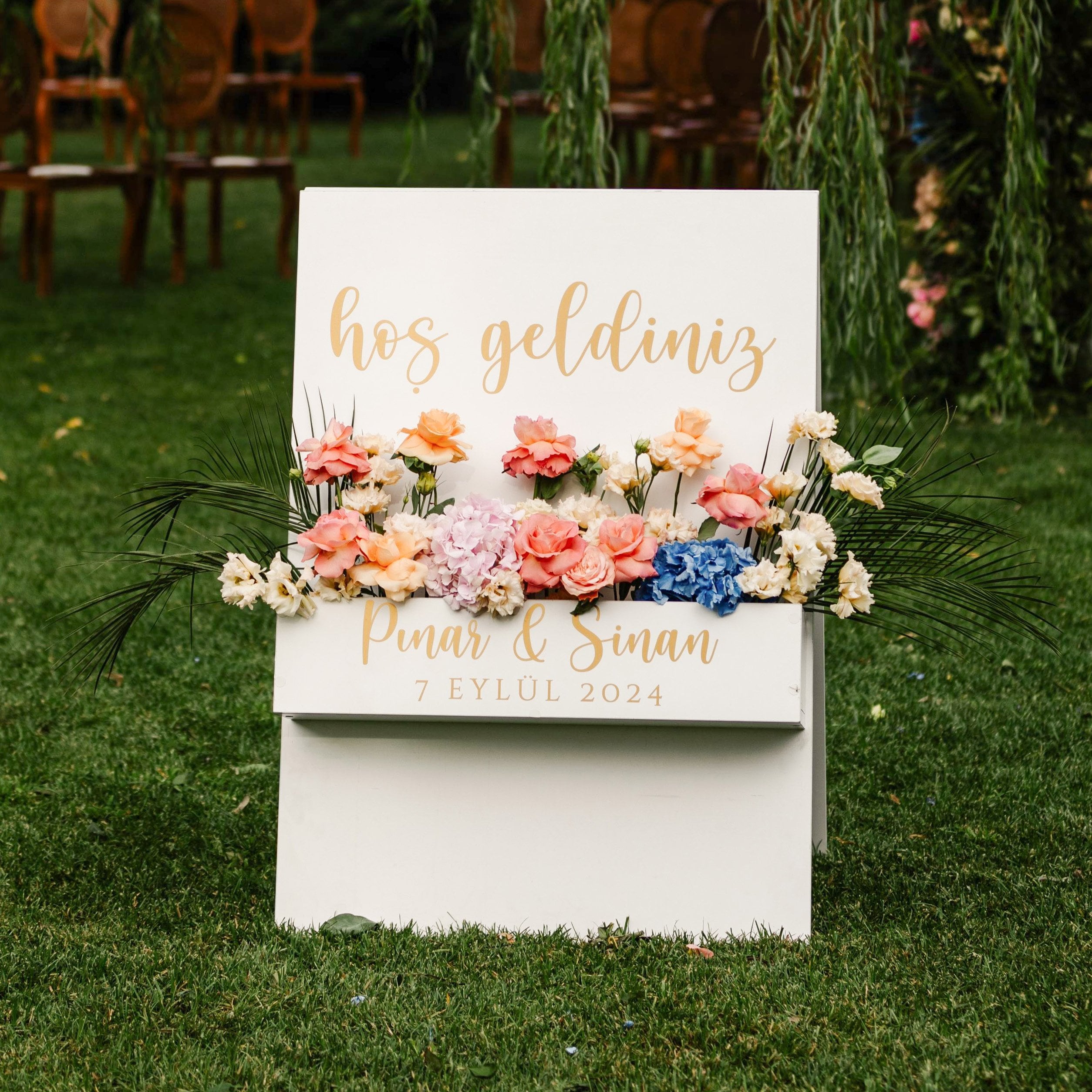 Davetlerinizin girişinde misafirlerinizi şıklıkla karşılayın! Ahşap MDF Karşılama Panosu, 70x100 cm ölçülerinde ve yerde kendi başına durabilen üçgen (A-frame) formuyla mekanınıza estetik bir dokunuş katar. Üzerindeki gold detaylı kişiselleştirme alanı, isimleriniz ve özel tarihinizle size özel olarak hazırlanır.