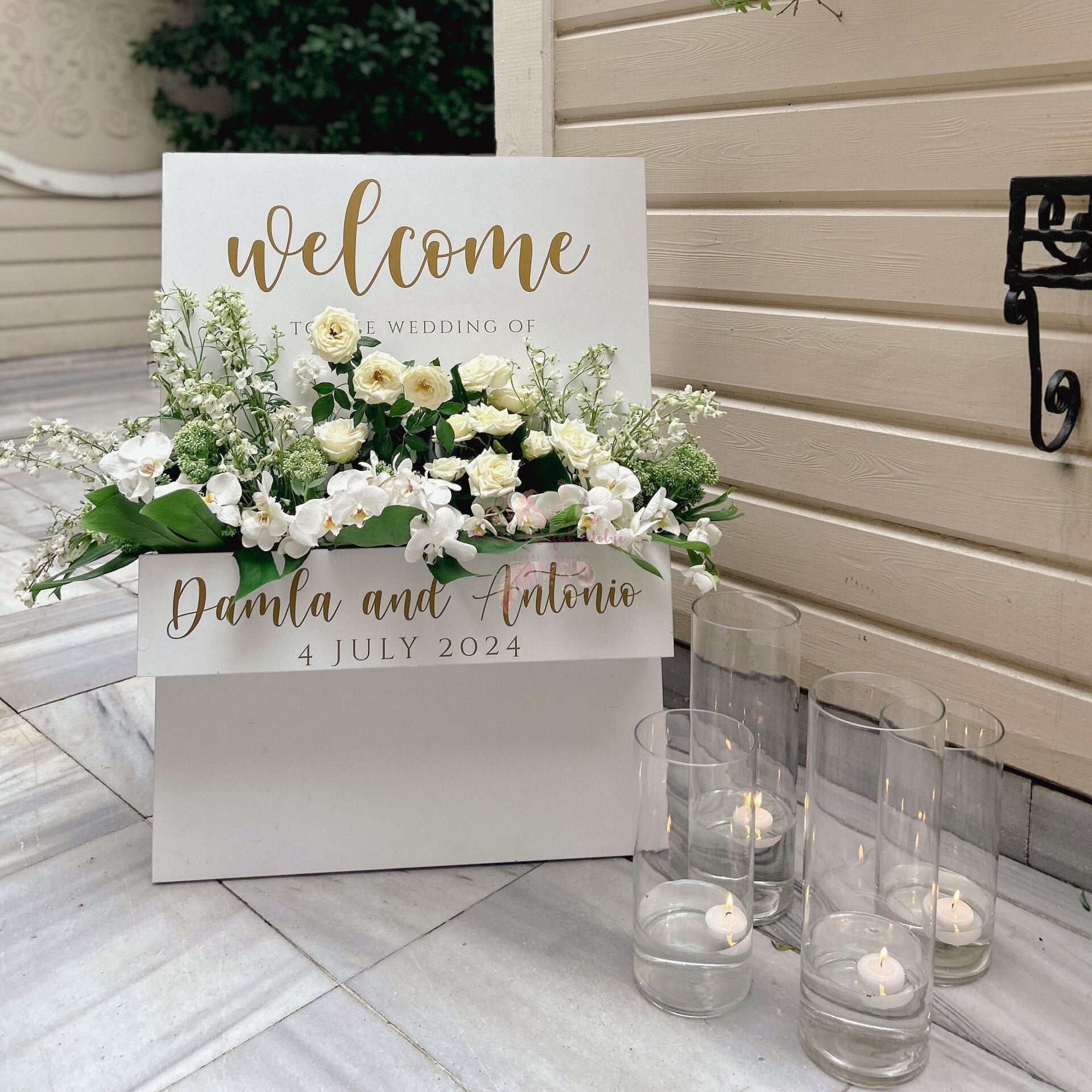 Davetlerinizin girişinde misafirlerinizi şıklıkla karşılayın! Ahşap MDF Karşılama Panosu, 70x100 cm ölçülerinde ve yerde kendi başına durabilen üçgen (A-frame) formuyla mekanınıza estetik bir dokunuş katar. Üzerindeki gold detaylı kişiselleştirme alanı, isimleriniz ve özel tarihinizle size özel olarak hazırlanır.