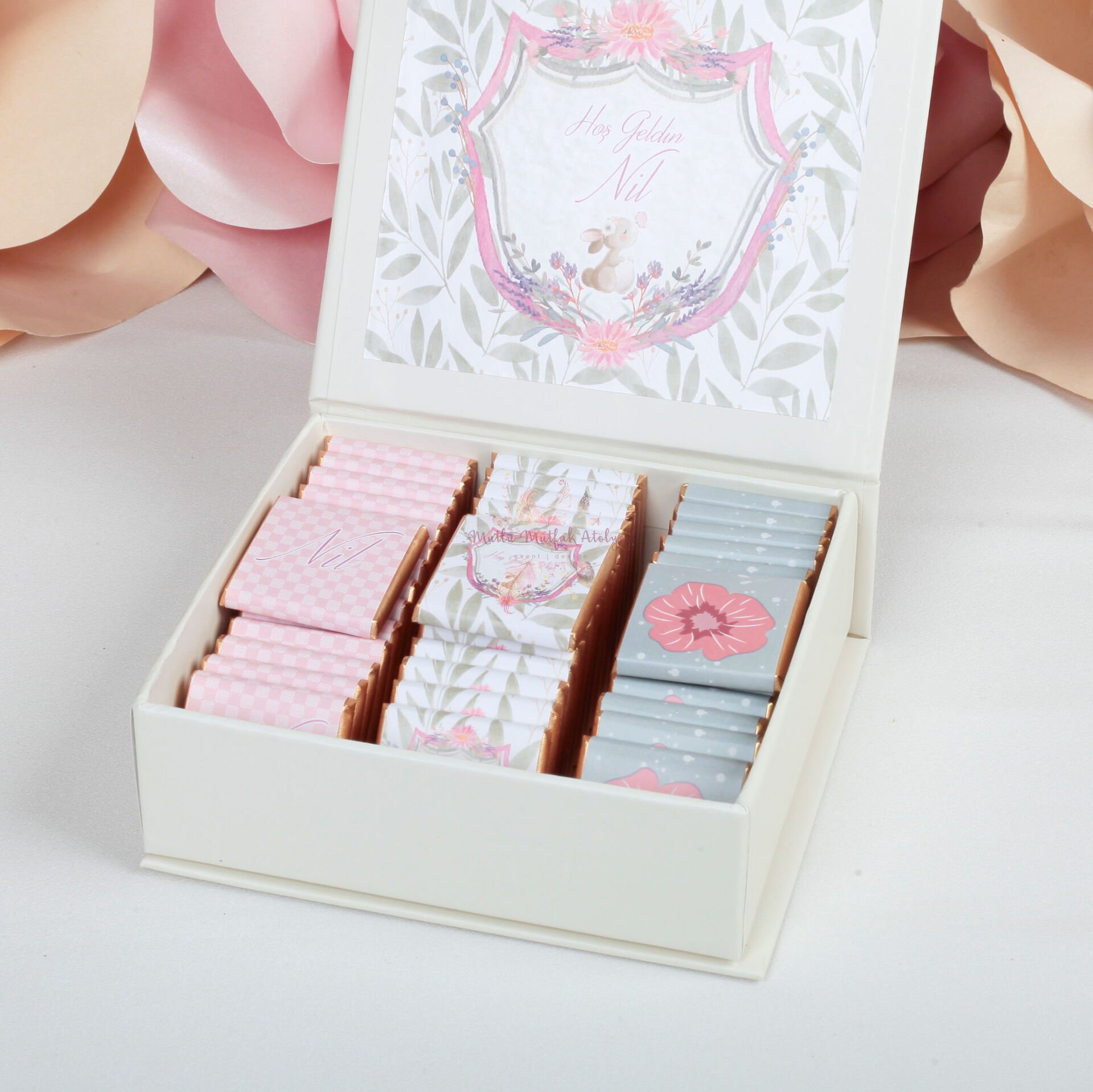 Kişiye özel tasarımlı kutusunda sunulan Valonia marka sütlü bebek çikolataları, şık tasarımı ve eşsiz lezzetiyle misafirlerinize unutulmaz bir ikram sunar.