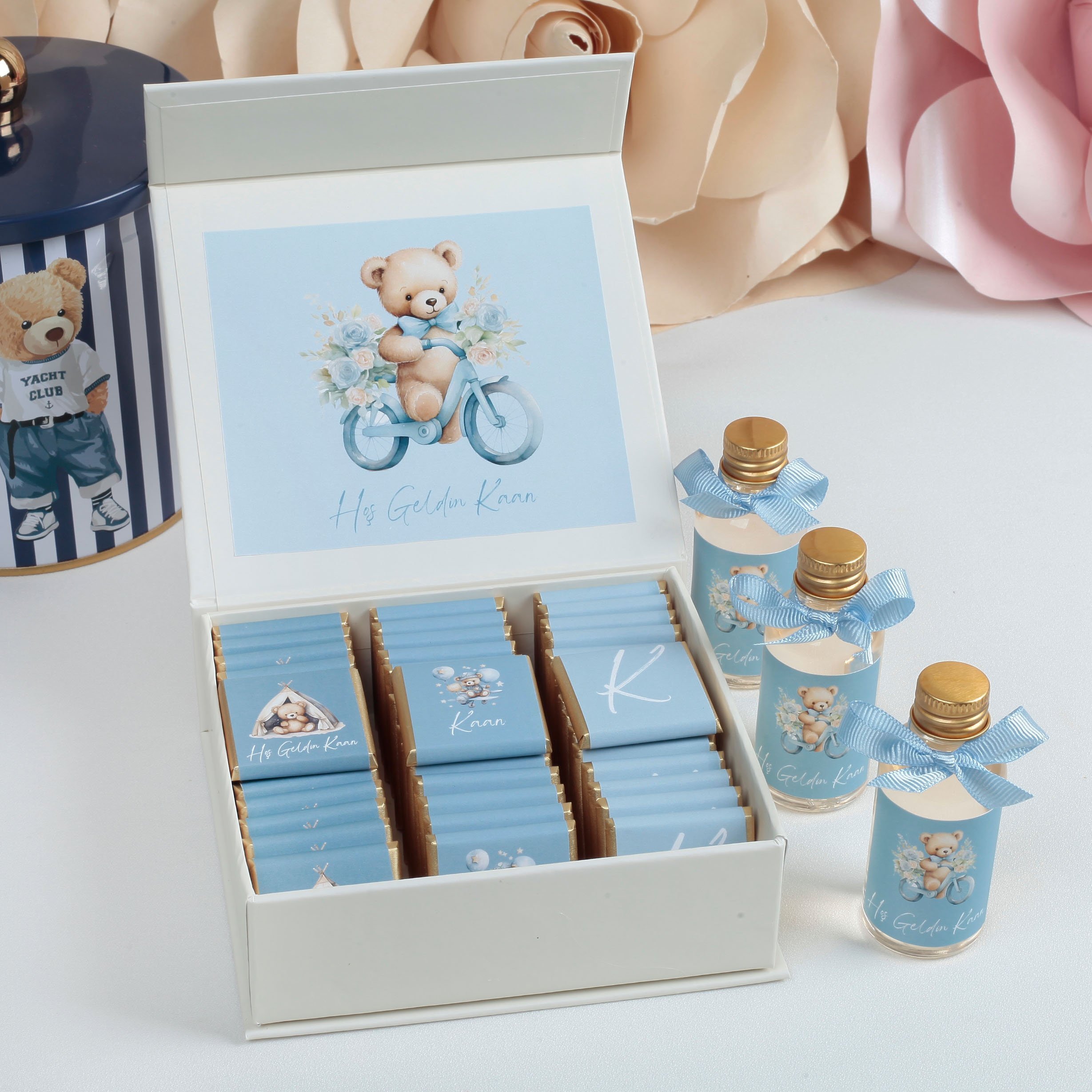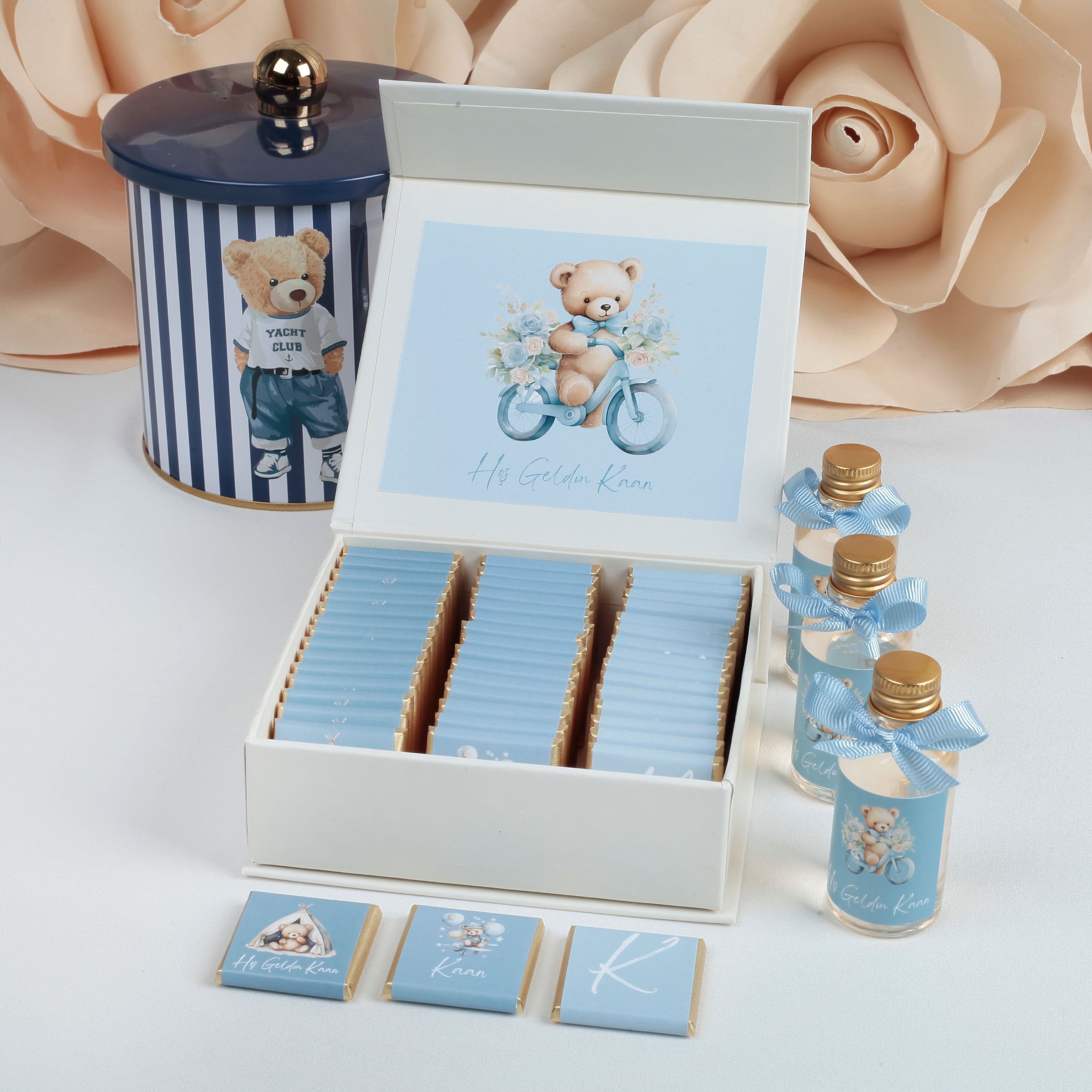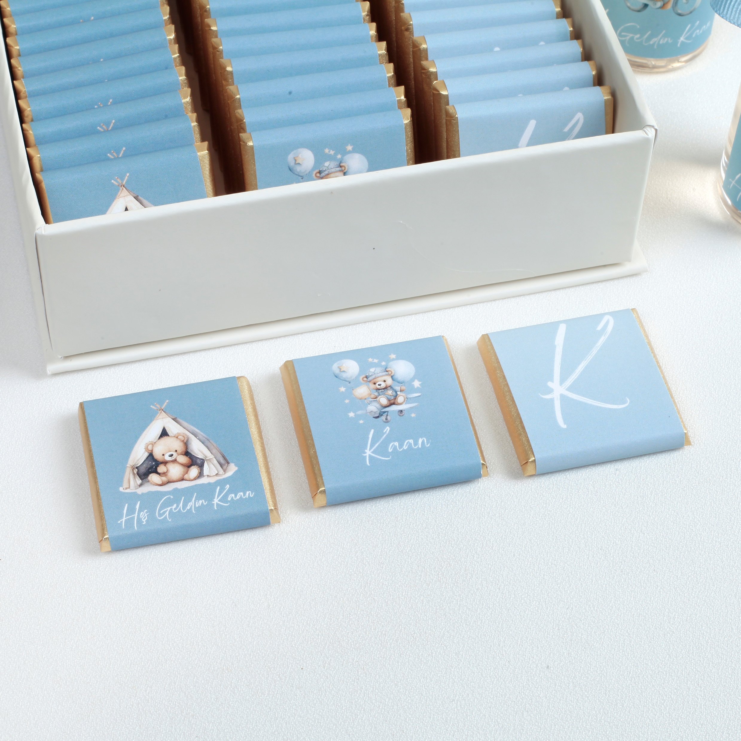 Kutu ölçüleri 10x10x5 cm olup, içerisinde 50 adet Valonia sütlü çikolata yer alır. Her bir çikolata özel ambalajında ve 4x4 cm ölçüsündedir. Ambalajlar bebeğinizin ismine ve seçilen görsele göre hazırlanır. Kutunun kapağında da bebeğinizin adı yer alır, bu sayede ürün hem ikramlık hem de özel bir hatıra olur.
