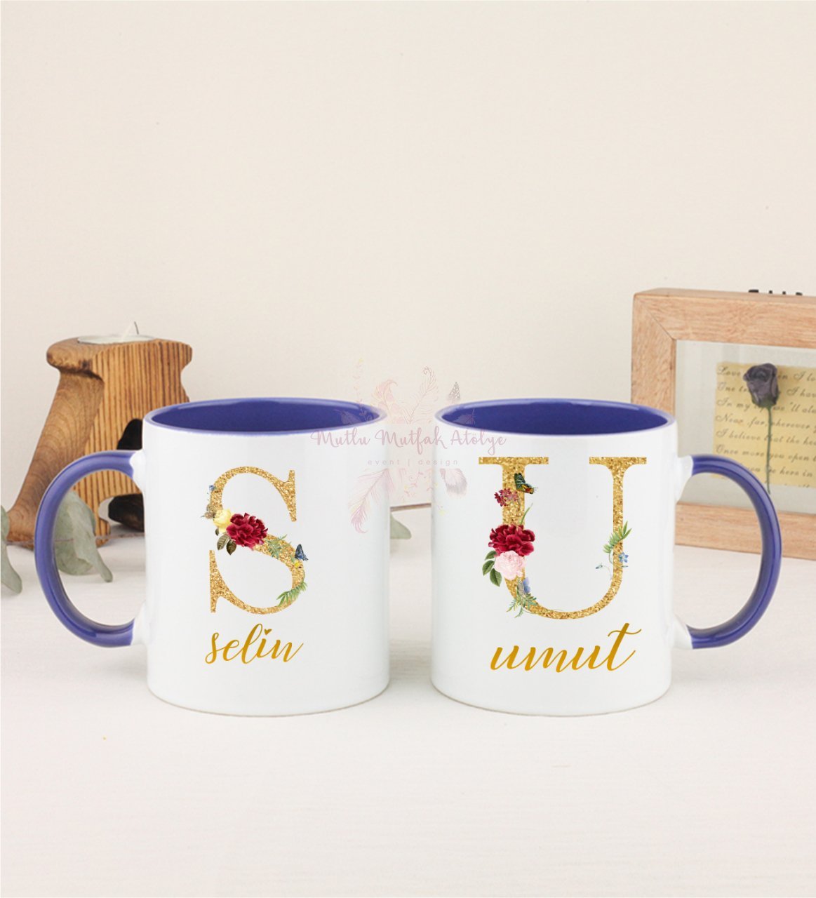 Kişiye Özel Gold Harfli ve İsimli İkili Lacivert Kupa Bardak