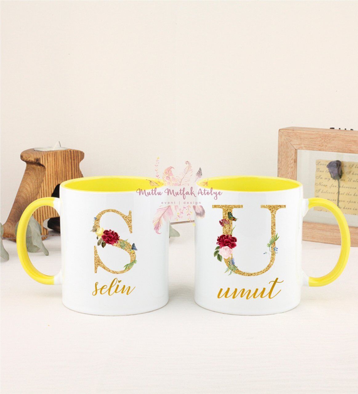 Kişiye Özel Gold Harfli ve İsimli İkili Sarı Kupa Bardak