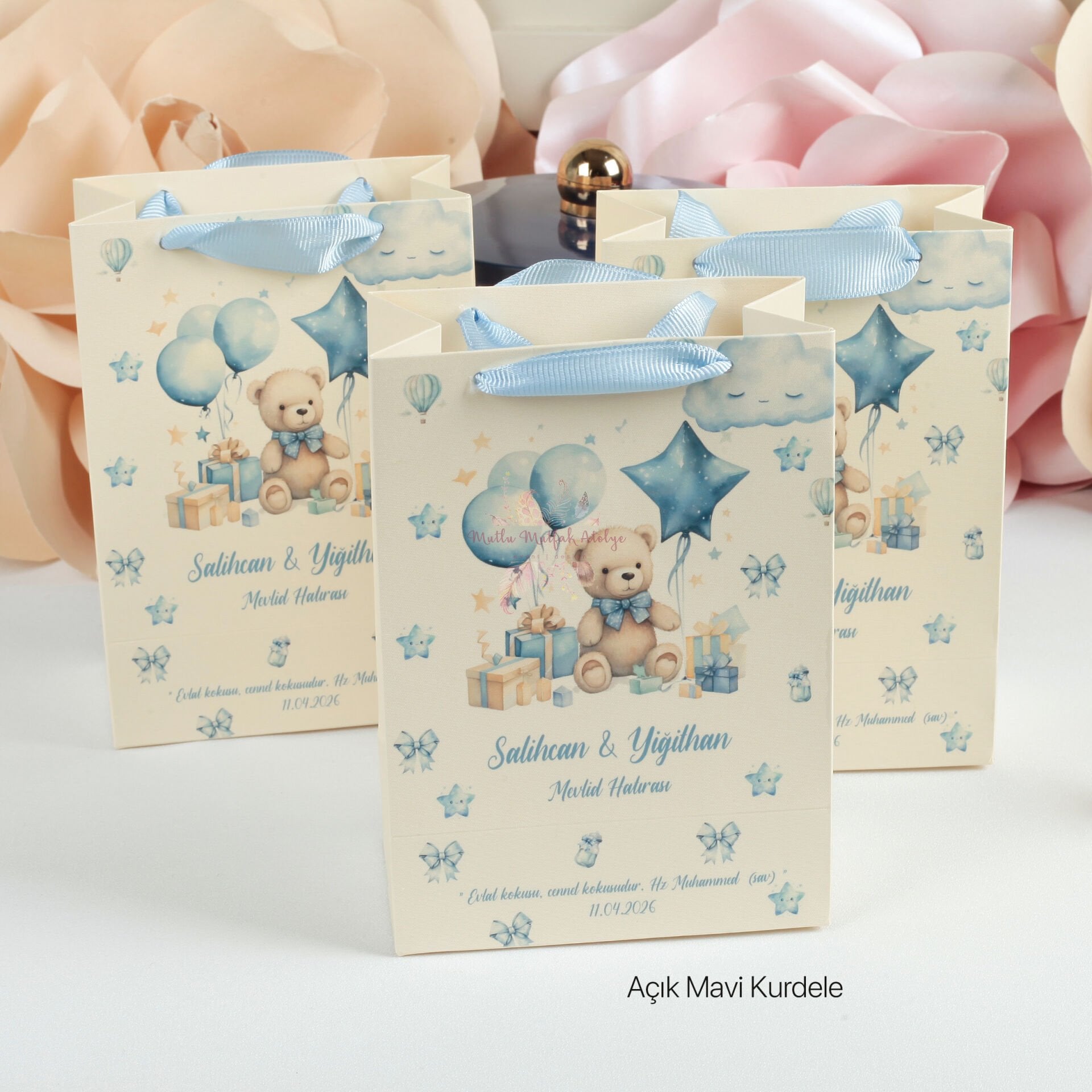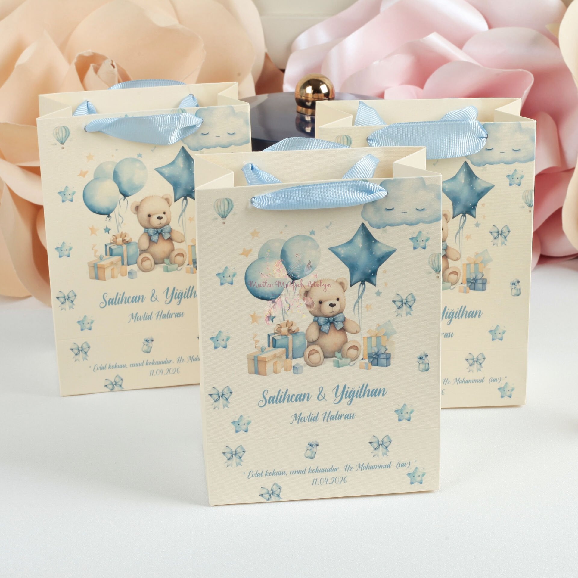 Özel günlerinize anlam katacak sevimli ayıcık figürleri ve bulut desenleriyle tasarlanan bu karton çantalar, misafirlerinize sunacağınız hediyeler için zarif bir paketleme seçeneğidir. Mavi kurdele sapları ve estetik görünümüyle özellikle bebek mevlidi ve doğum günü konseptleri için idealdir.