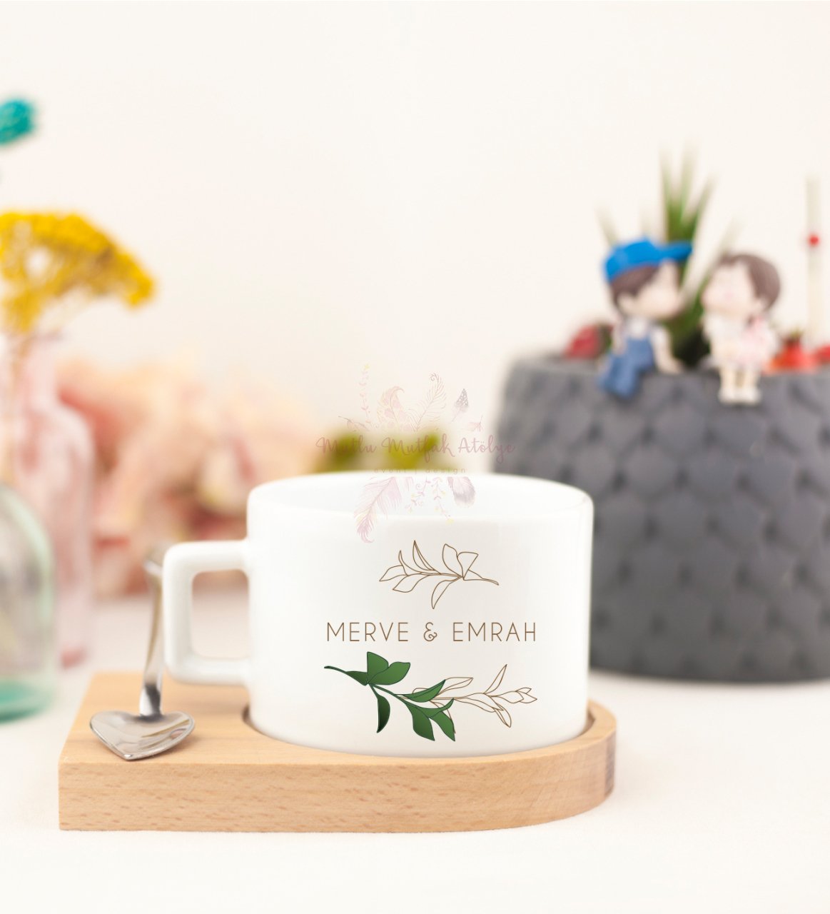 Kişiye Özel İsimli Çiçek Motifli Ahşap Altlıklı Fincan