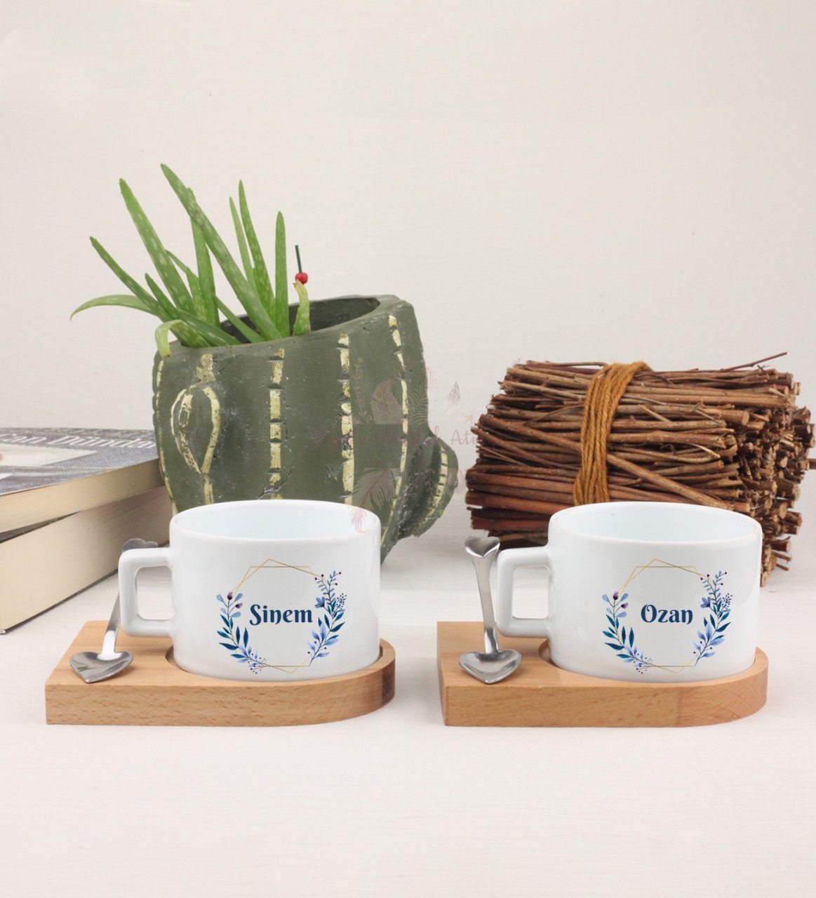 Kişiye Özel İsimli Çiçek Motifli İkili Ahşap Altlıklı Fincan