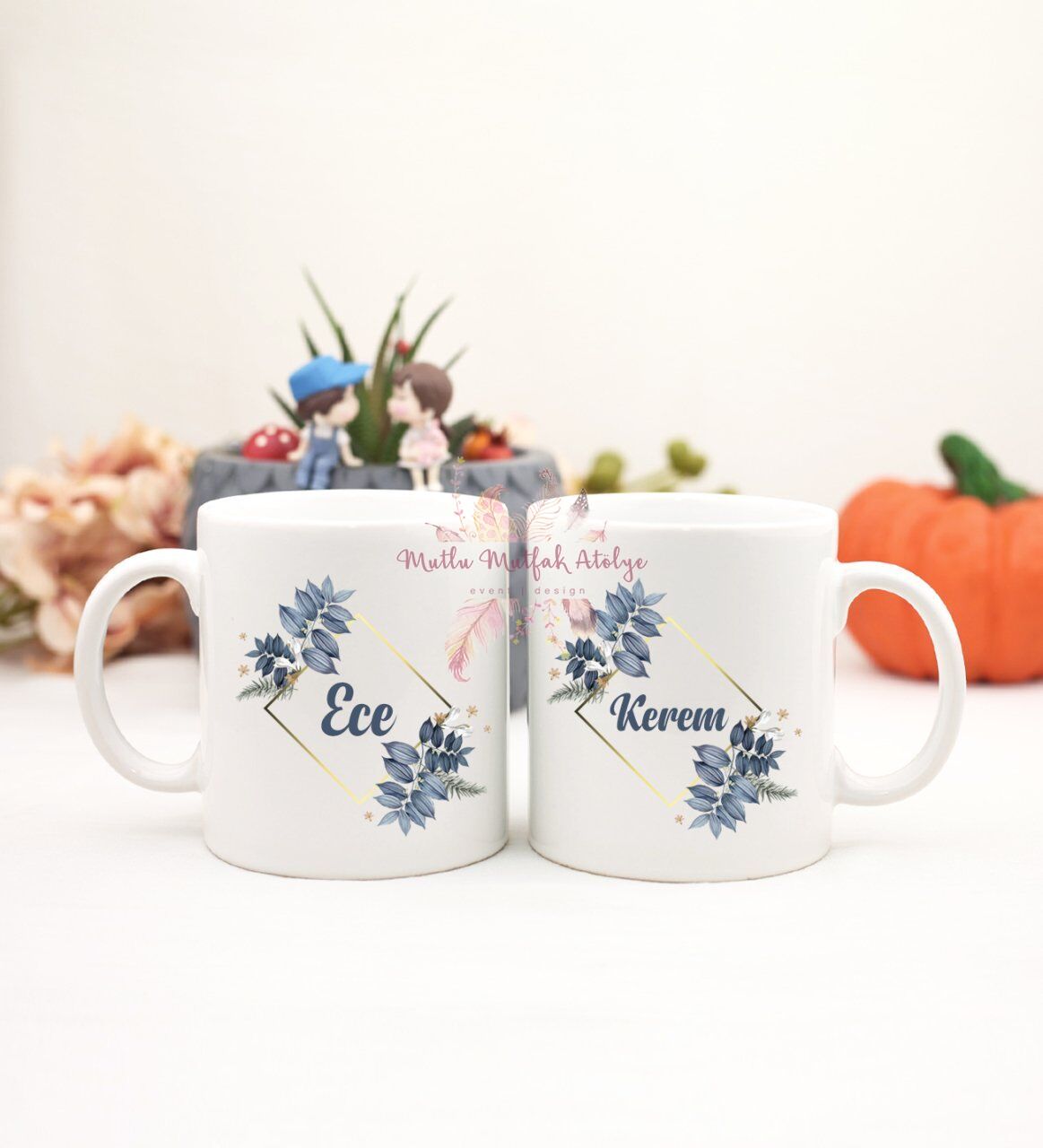 Kişiye Özel İsimli Çiçek Motifli İkili Kupa Bardak