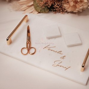 - Ürün içeriğinde gold makas, mermer tepsi, gold yazılı isim standart olarak yapılmakta olup tüylü yüzük kutusu ya da 2 adet yüzük için mermer yükselti tercih edilebilmektedir.