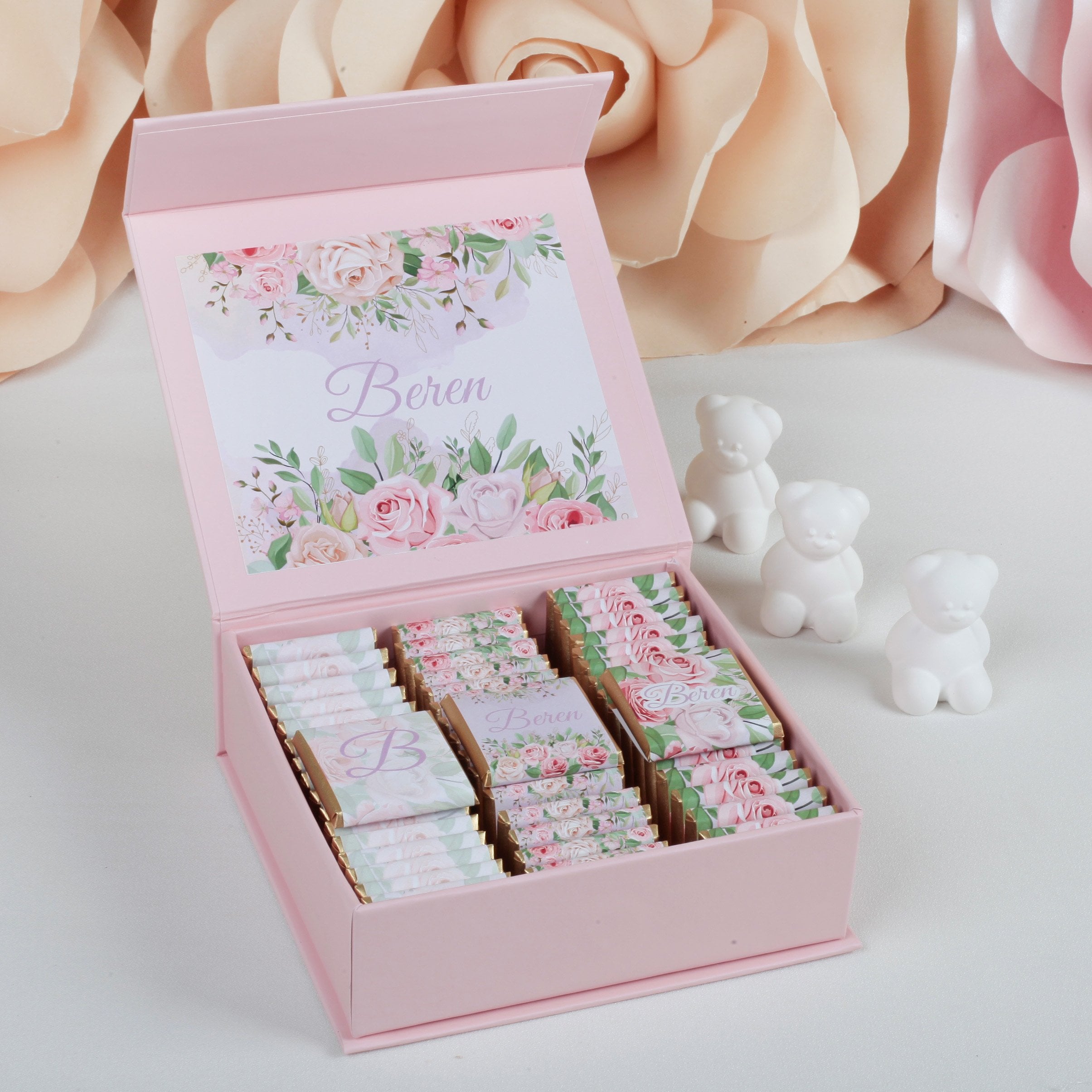Kişiye Özel Kız Bebek Çikolatası - Pembe Çiçek Temalı ve İsim Baskılı (Valonia Sütlü Çikolata 50 Adet)