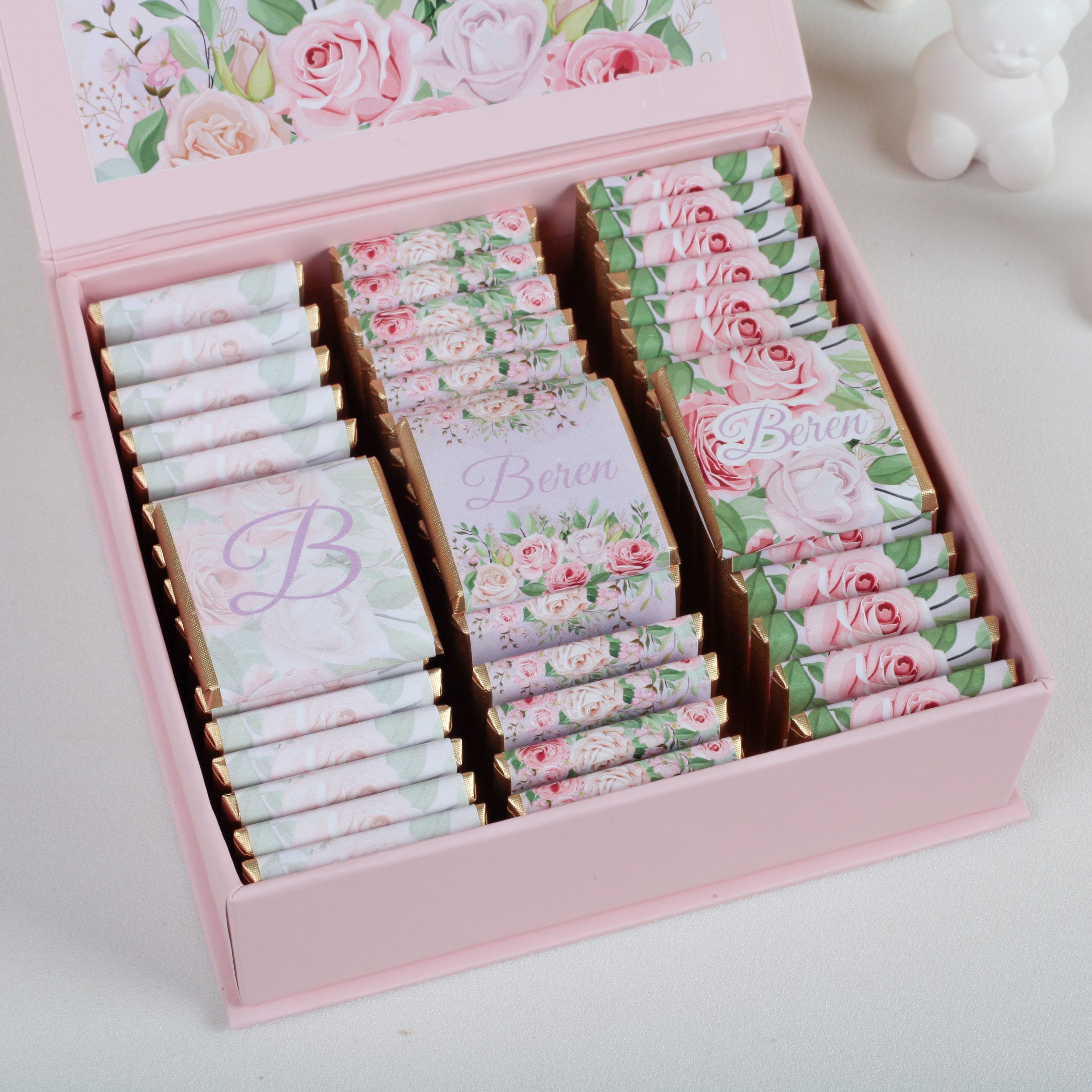 Kutu ölçüleri 10x10x5 cm olup, içerisinde 50 adet Valonia sütlü çikolata yer alır. Her bir çikolata özel ambalajında ve 4x4 cm ölçüsündedir. Ambalajlar bebeğinizin ismine ve seçilen görsele göre hazırlanır. Kutunun kapağında da bebeğinizin adı yer alır, bu sayede ürün hem ikramlık hem de özel bir hatıra olur.