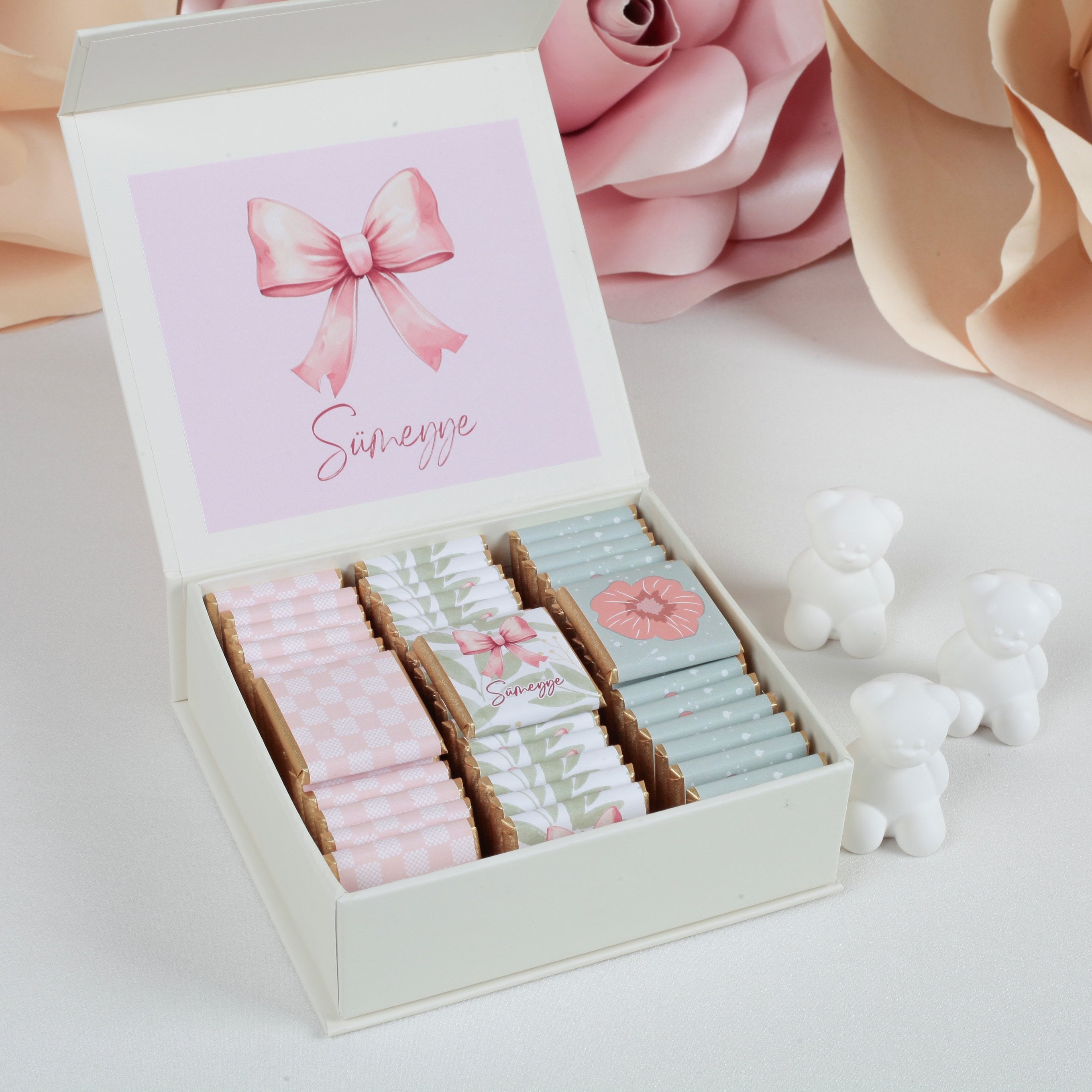 Kutu ölçüleri 10x10x5 cm olup, içerisinde 50 adet Valonia sütlü çikolata yer alır. Her bir çikolata özel ambalajında ve 4x4 cm ölçüsündedir. Ambalajlar bebeğinizin ismine ve seçilen görsele göre hazırlanır. Kutunun kapağında da bebeğinizin adı yer alır, bu sayede ürün hem ikramlık hem de özel bir hatıra olur.