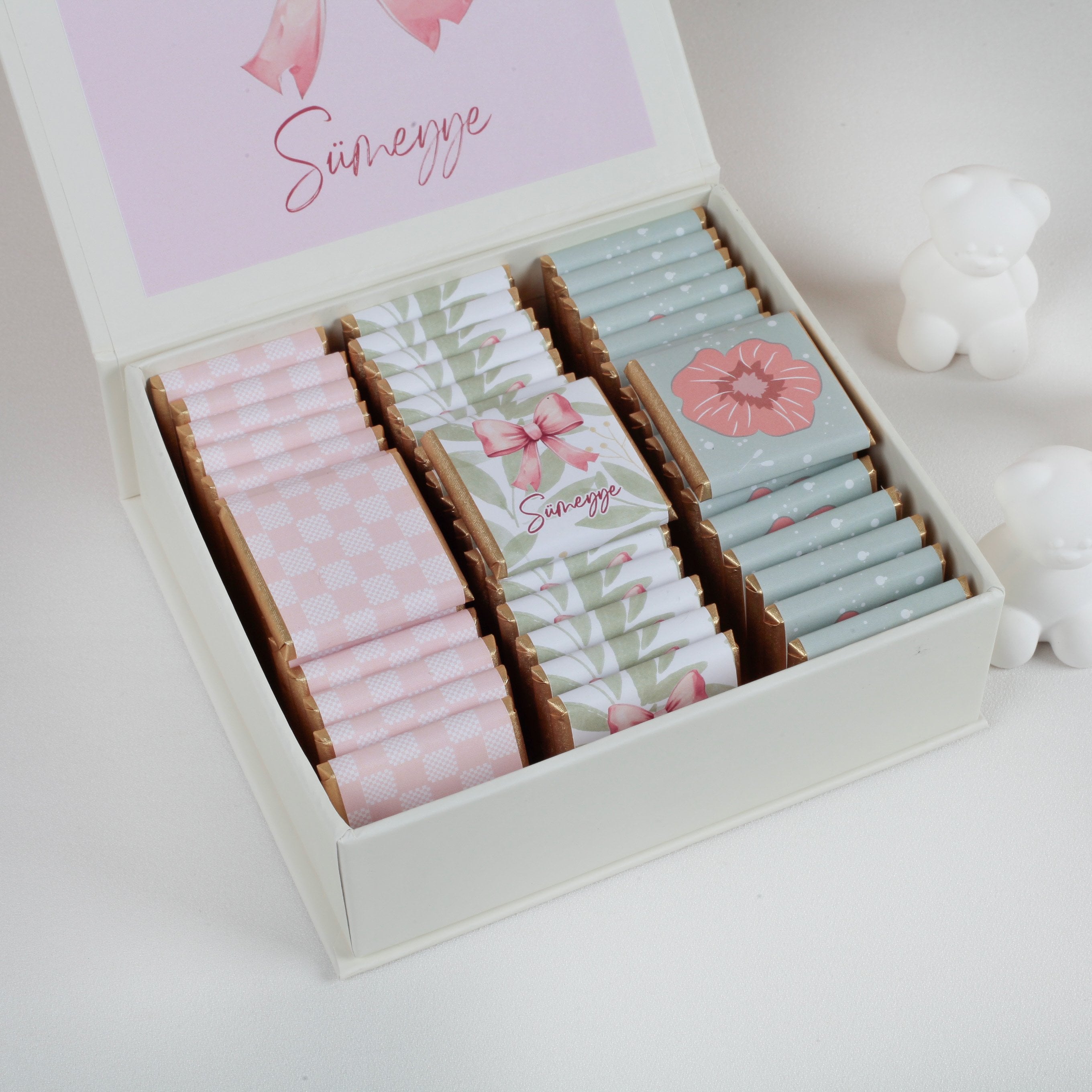 Kişiye özel tasarımlı kutusunda sunulan Valonia marka sütlü bebek çikolataları, şık tasarımı ve eşsiz lezzetiyle misafirlerinize unutulmaz bir ikram sunar.