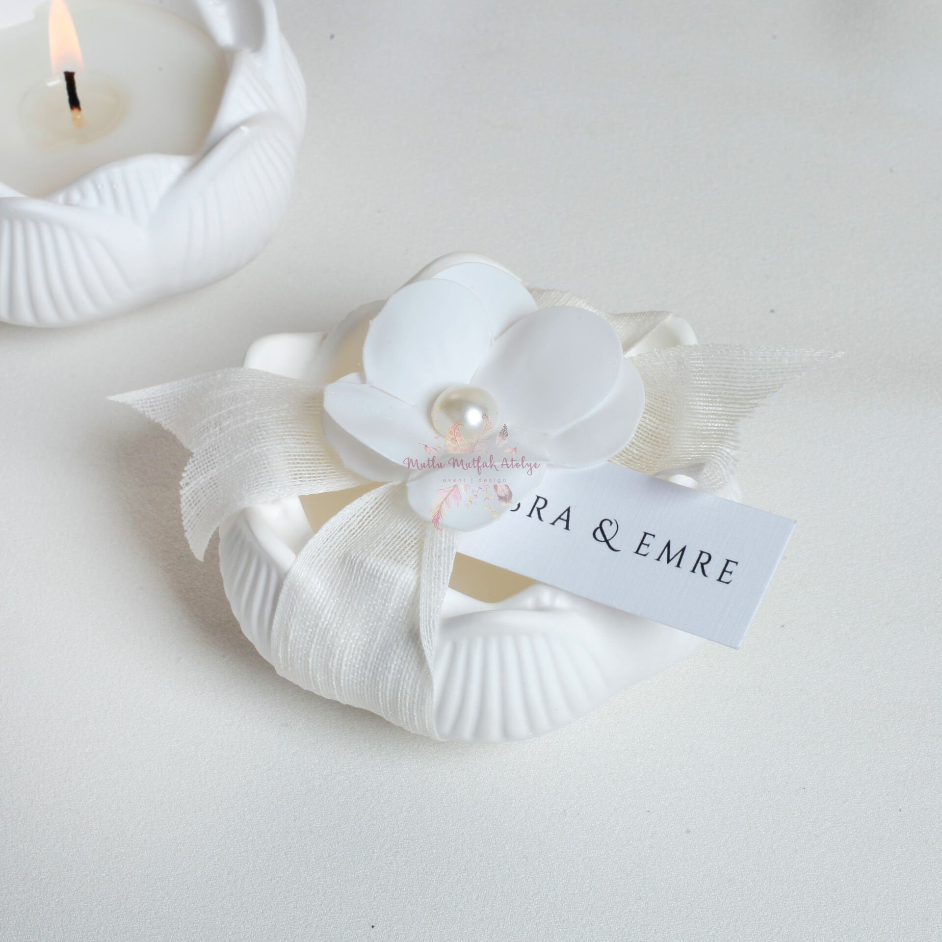 Süsleme: Doğal keten kurdele, yapay çiçek, inci süsleme ve kişiselleştirilebilir isim kartı