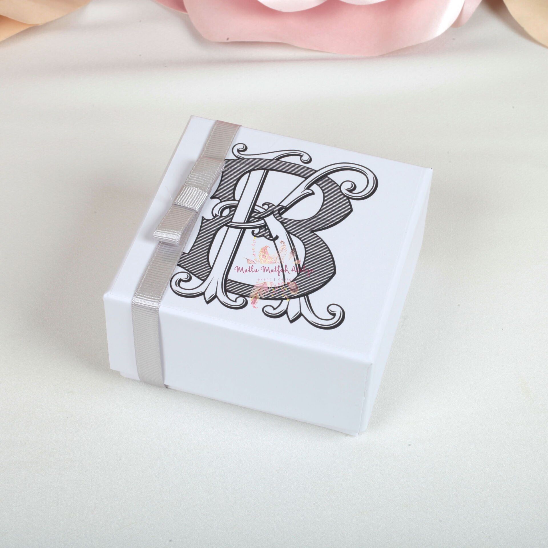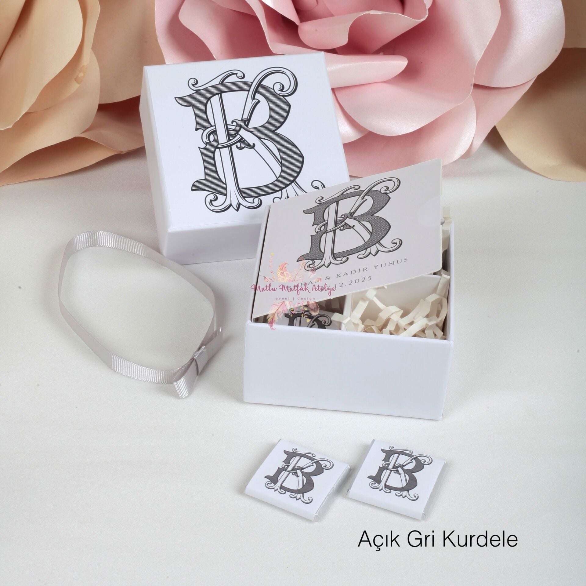 Kutu, dört ayrı bölmeye sahiptir ve üzerinde yer alan özel harf baskısı ve açık gri kurdele ile süslenmiştir.