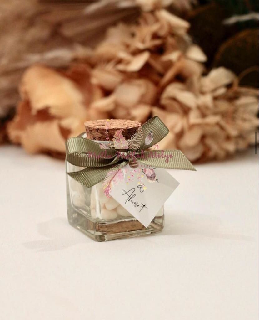 Mantar tıpalı minik kare şişelerimiz, düğün, nişan, kına ve doğum günü gibi etkinliklerinizde misafirlerinizi şımartmak için mükemmel bir seçenek.
