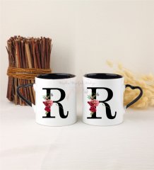 R Harfi Çiçek Desenli İkili Siyah Kalpli Kupa Bardak