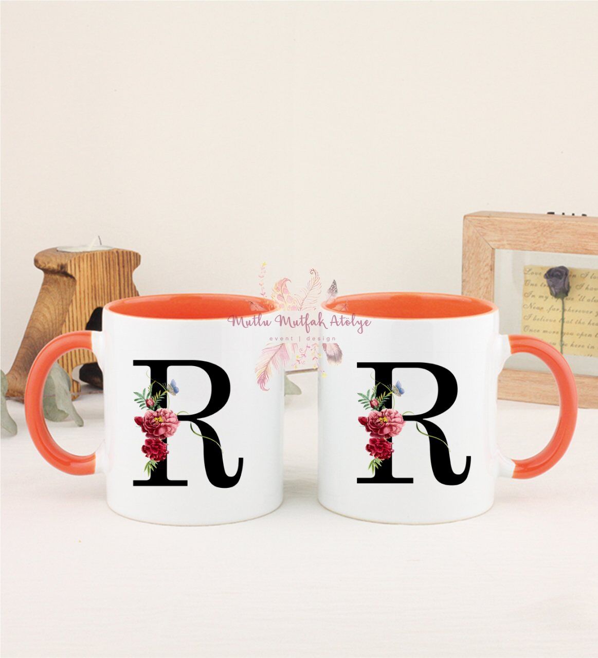 R Harfi Çiçek Desenli İkili Turuncu Kupa Bardak