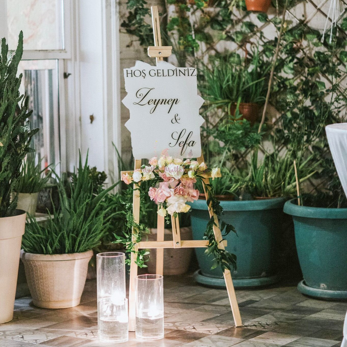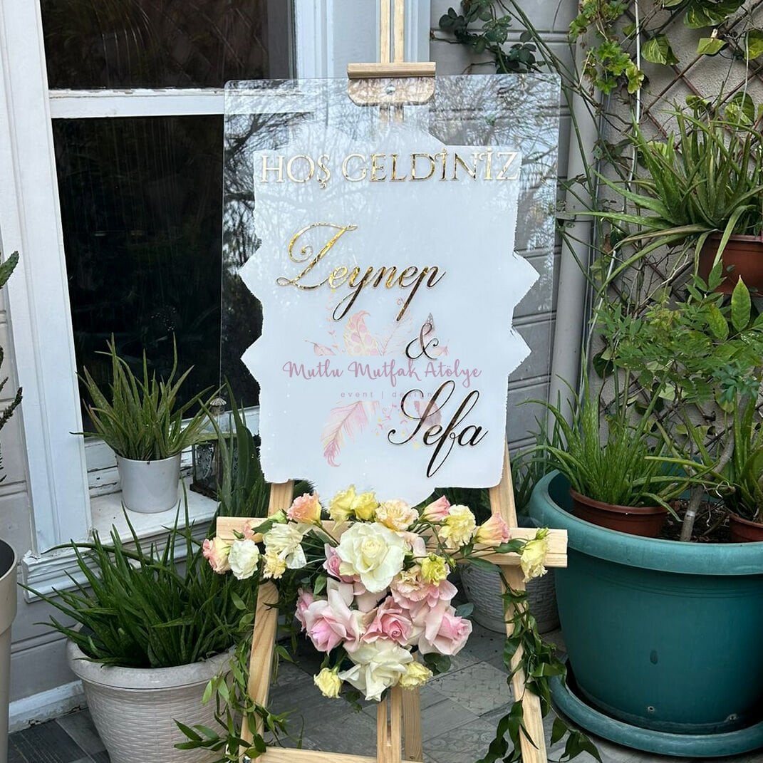 Not: Görseldeki şövale (ayaklık) ve çiçek süslemeleri fiyata dahil değildir; ürün sadece pleksi pano olarak gönderilmektedir.