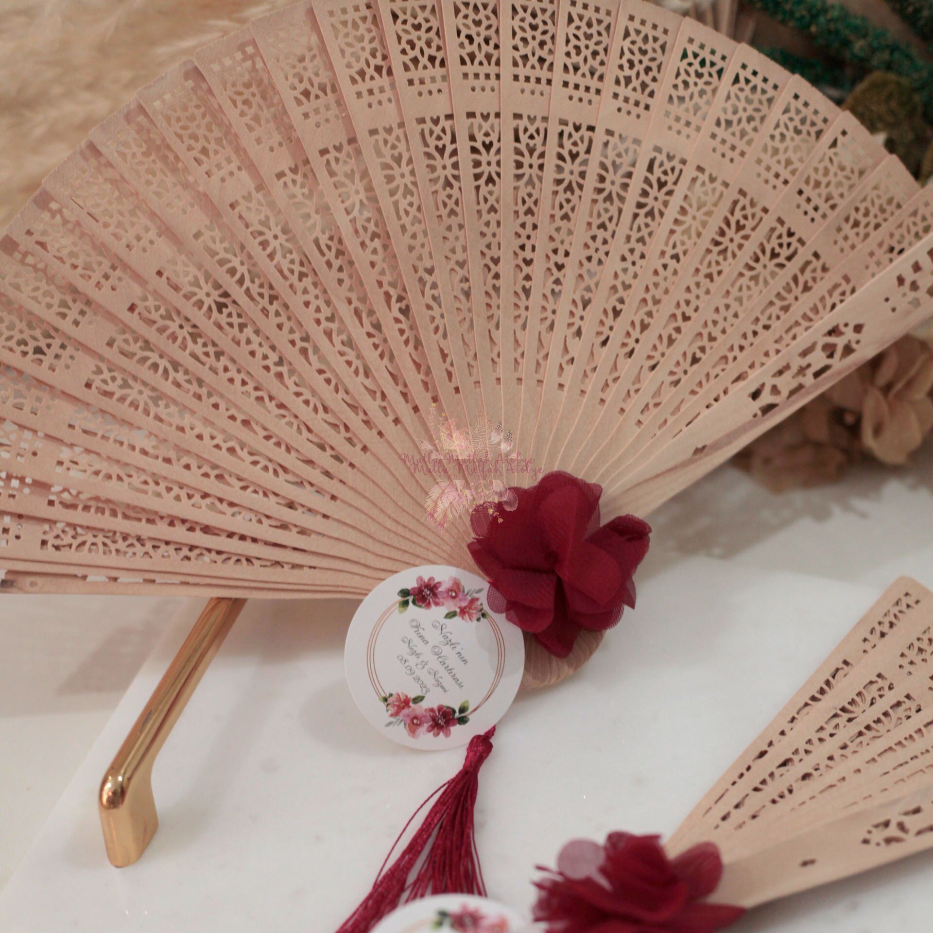 Süslenmiş Bordo Çiçekli Bambu Yelpaze Doğum Günü Hediyeliği