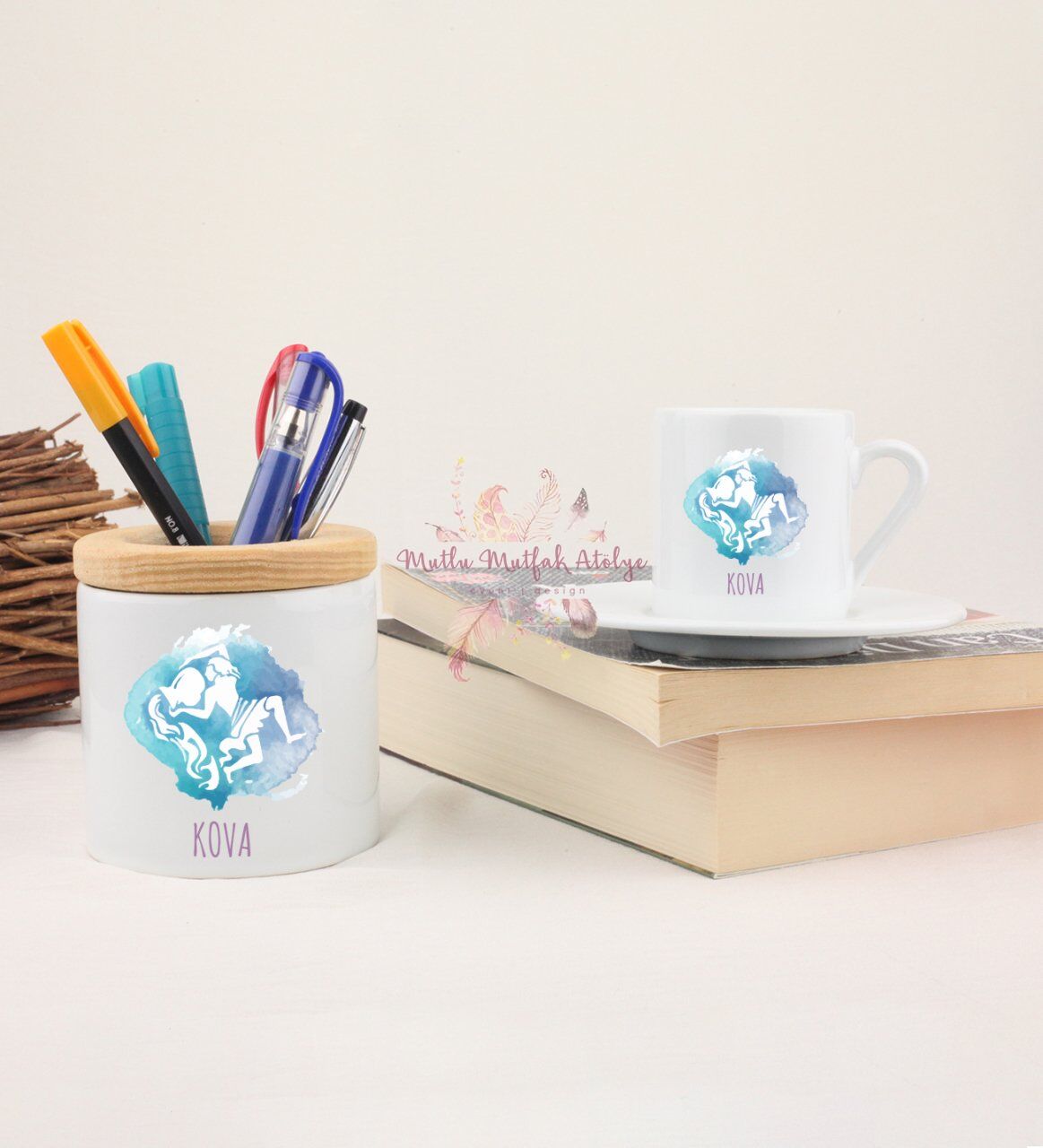 Türk Kahvesi Fincanı ve Kalemlik Seti Kova Burcu